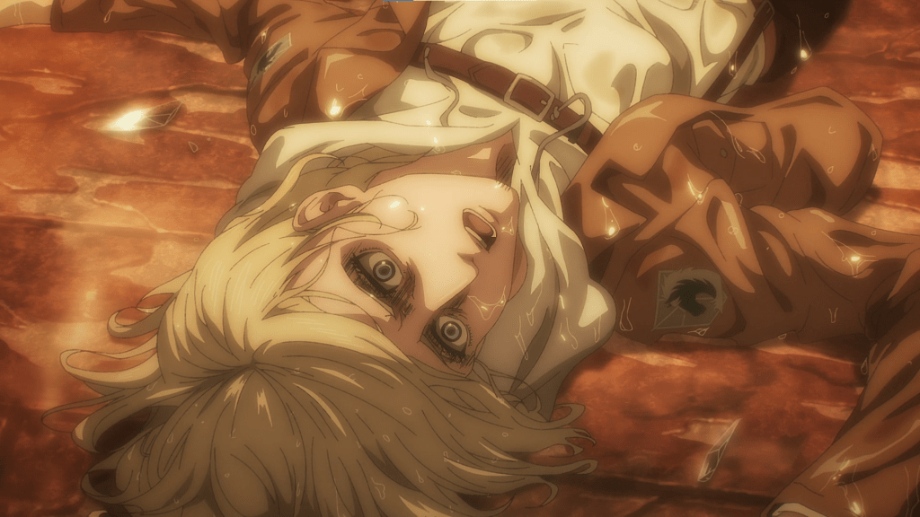 The show does a weird transition into the aftermath of defeating all of Zeke’s titans. We are left with a final scene with Mikasa and Armin talking to Gabi about Falco. Once Gabi mentions Reiner losing his hardening, Armin realizes what Eren meant by “undoing the hardening.”