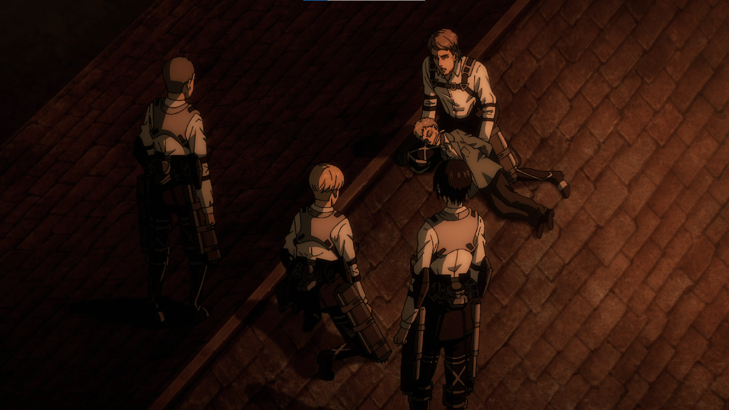Once Connie takes Falco, the remaining members are forced to deal with the titans in the surrounding area. With a change of pace and some uplifting music, we get to see the Paradis troops do something positive and meaningful again! Standing at the top of the tower, the group of soldiers go out and kill their former comrades that turned into pure titans. This scene highlighted the ending for one of the show’s major characters, Commander Pixis. Another noteworthy character, that has contributed heavily to the overall quality of the show. It’s nice to get acknowledgement through the anime’s other main characters: Armin, Mikasa and Jean.