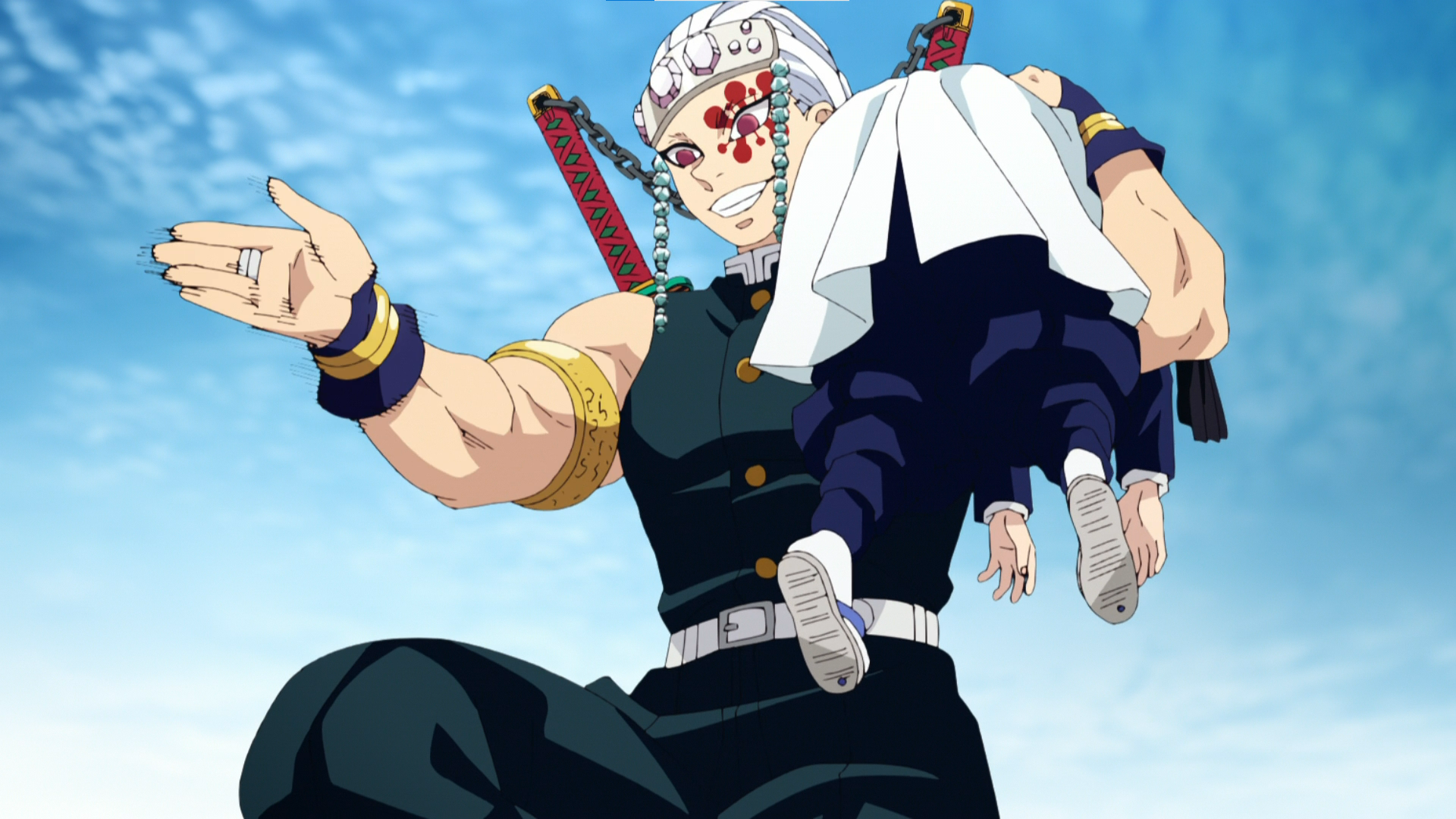 When faced with the arc’s biggest adversary, not once did Uzui show any fear. He faced the duo of “Upper Demon Rank 6,” Gyutaro and Daki, head on. He beheaded Daki, not once, but twice like it was nothing. By the time Inosuke and Zenitsu arrived, he already figured out how to defeat them—cut both of their necks off at the same time. With the help of Tanjiro, backing him up, he ultimately led the way to Gyutaro’s demise. At any point in the arc, was there ever a scene with him, that disappointed? No.