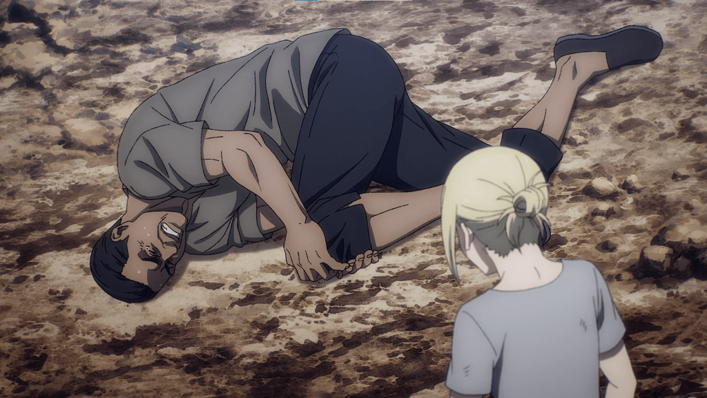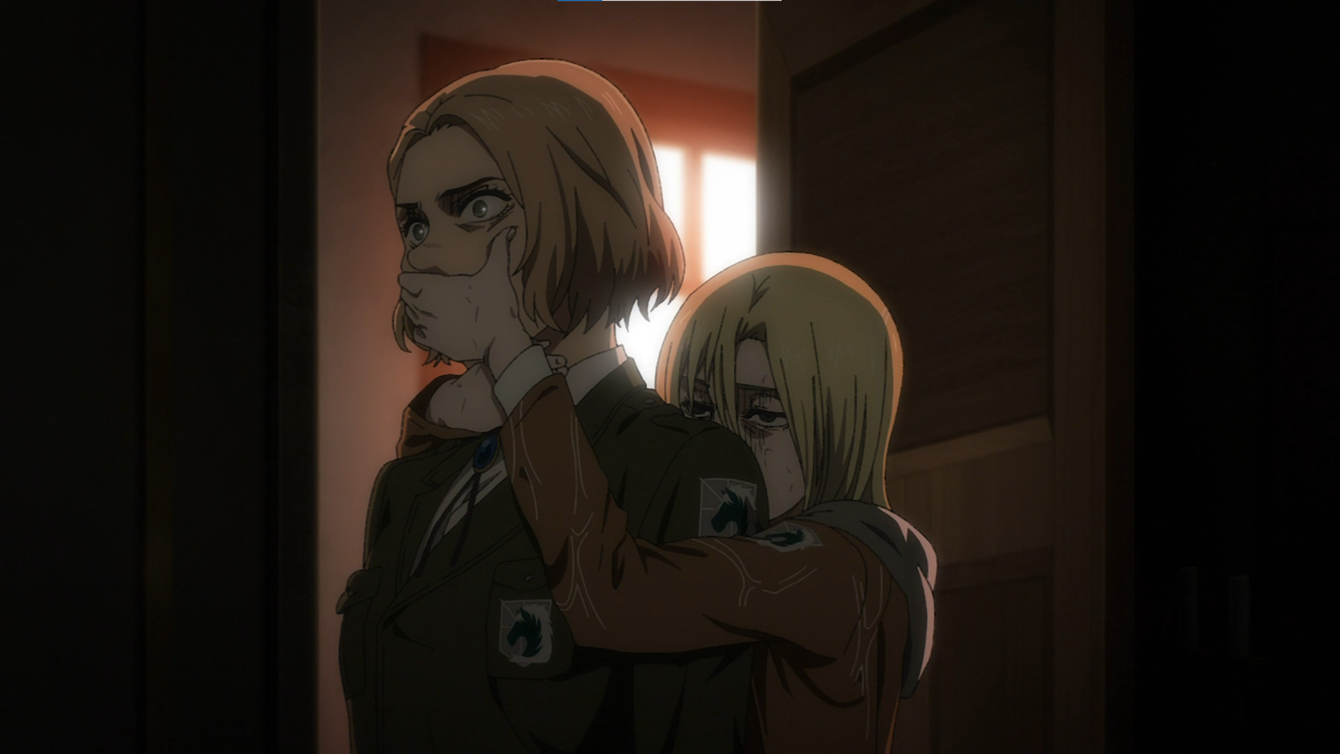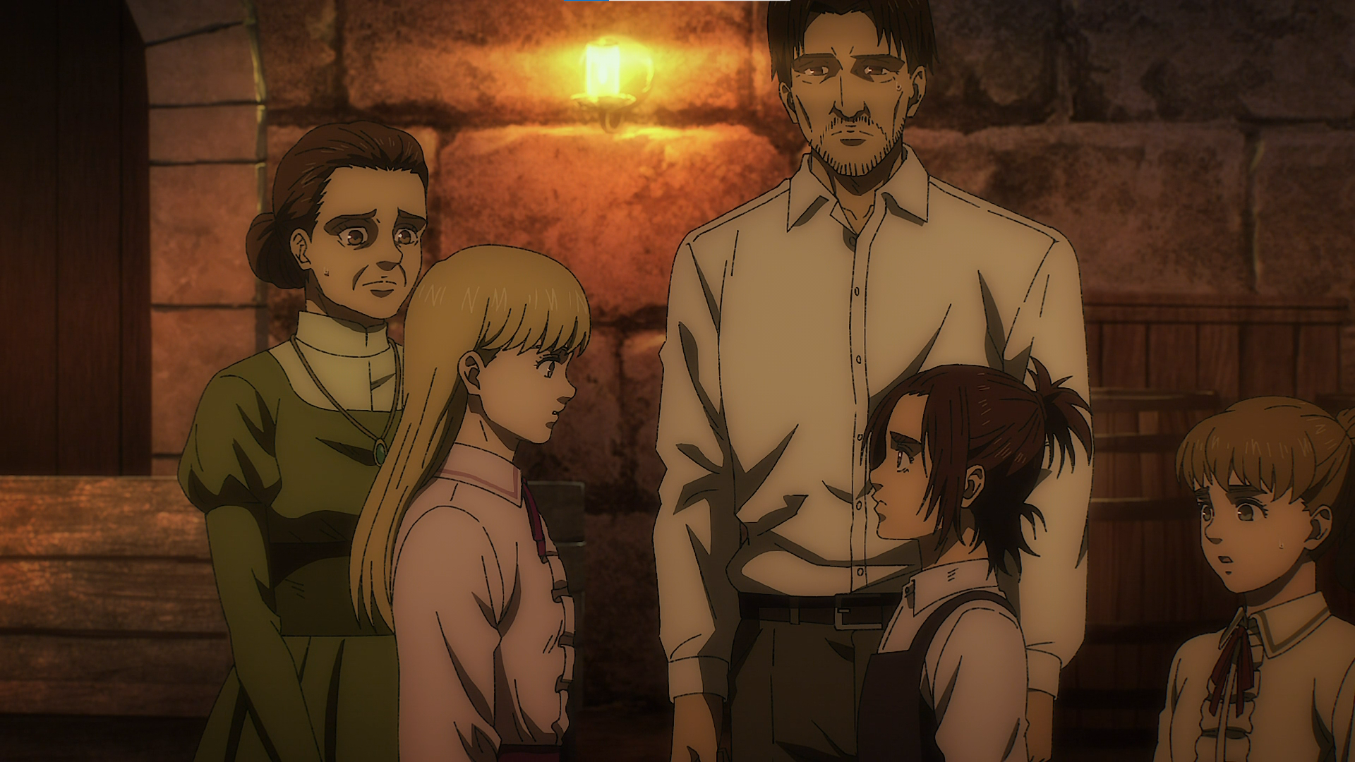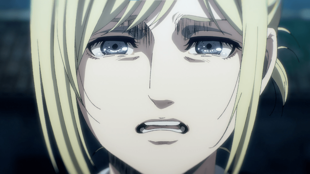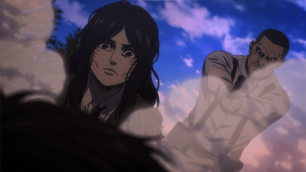 AoT has a huge lineup of characters that the viewer needs to care about. Now, we have a character being re-introduced, who hasn’t been important since season one. The first half of the episode is straight up her backstory. She was found by another encampment Eldian in Marley, that trained her to become the fighter she is today. Without any real family, she is basically an orphan and her one true connection is this father figure that helped build her into who she is now. After she became a soldier, she was praised to kill, but to her, it didn’t matter either way. Being awake now, she could care less about what Eren is doing, except her sole reason is to try to save this father figure of her. Then, she relates that she is no different than everyone else that wants to save a family member. Moments later, we get a scene with said father, that may have been shot dead.