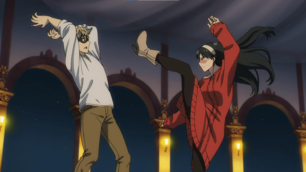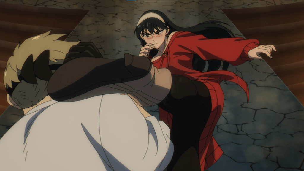 Yor, being the first hand-to-hand witch anyone has ever witnessed gets engaged to Loid again. Only this time, they’re scrapping. Here, we get some nice hand-to-hand combat animations with an epic boss-battle soundtrack to match. Yor’s heel eventually break and Loid easily takes down Franky with a nice backhand slap.