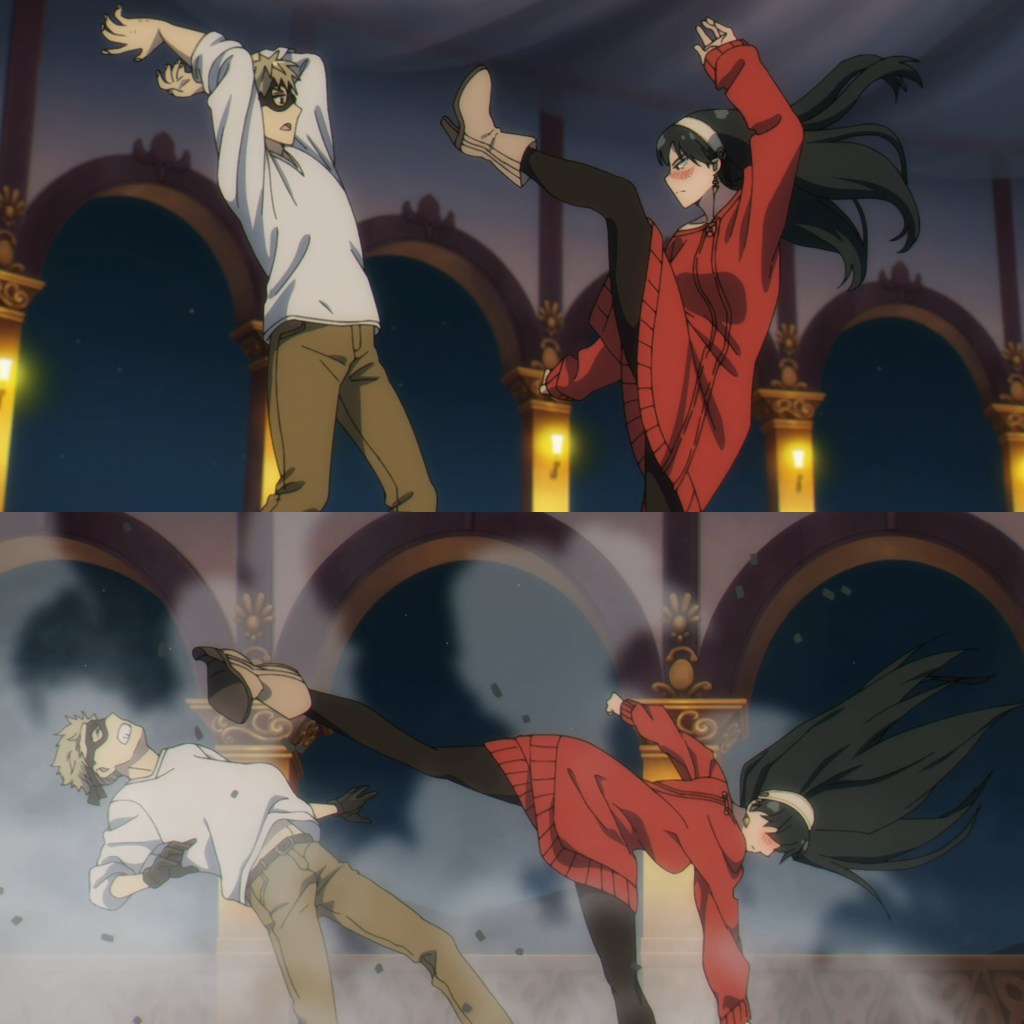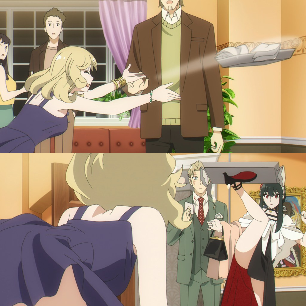 At the beginning of this episode, we kind of got the idea of who Yor is. She’s a bit of an airhead and for an assassin, displays an endearing morality. Then, when Loid comes out of nowhere all bloodied up, Camilla tries to ruin Yor’s good feel moment by spilling a tray of food on her. Little did she know, Yor just nonchalantly stops it with a high kick. At this moment, we all realized what kind of satirical comedy we’re getting.