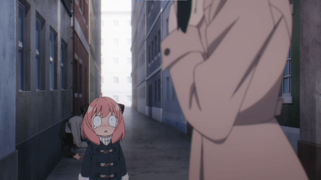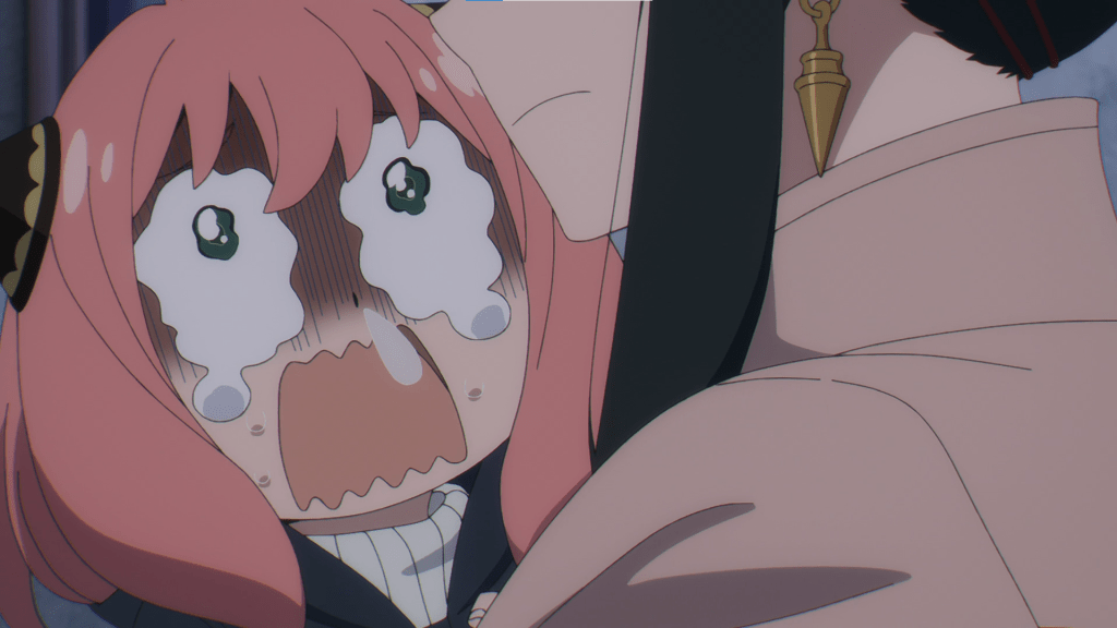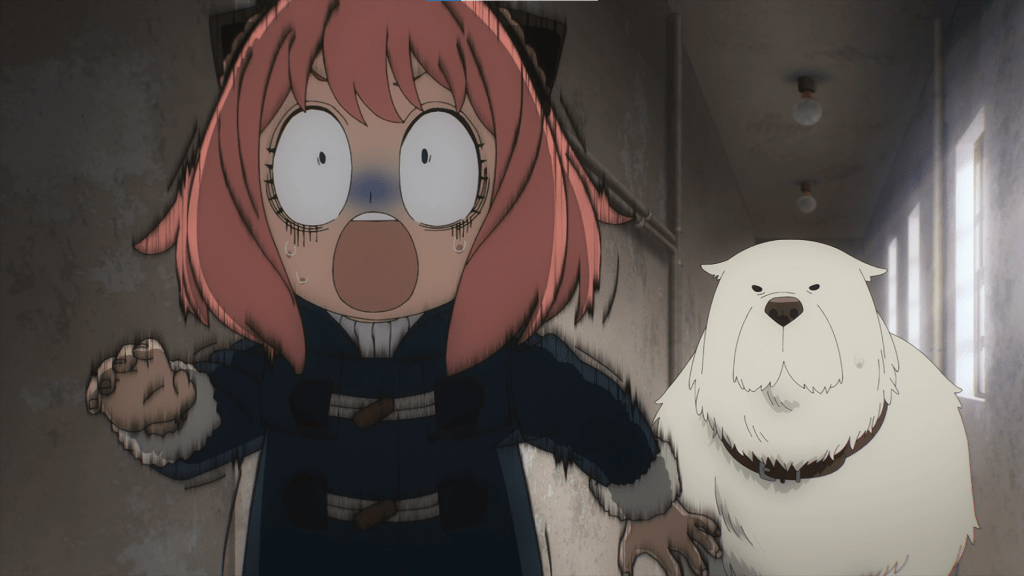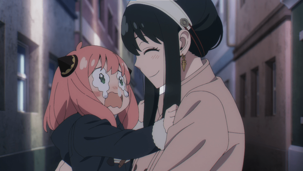 Keith runs off and Yor tries to chase after him. She stops midway, realizing that she’s not going to abandon Anya. Anya goes on to explain that the dogs are attached with bombs and then Yor inspects the white fluffy derpy dog. Thankfully, there was none. This scene concludes with Yor and Anya having a heartwarming moment as Anya apologizes for irresponsibly leaving Yor’s side.