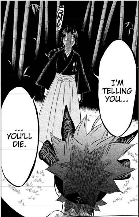 Asta displays his natural ability to use Zetten and is quickly thrown into the fire. By “throwing into the fire,” I mean an all out battle against Ichika. Ryuya suggests that it would be the most advantageous to get better at using Zetten by fighting Ichika. With Asta putting on his Devil Union cloak and getting ready to engage, Ichika scoffs at Asta’s strength. He’s at such a low level compared to Ichika that she doesn’t think Asta is being serious. Fumito mentions that Asta “cloaking himself in anti-magic” would be able to “block simple yojutsu.”