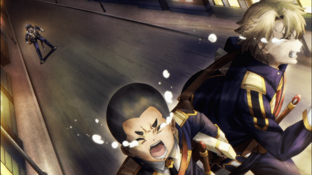 It’s getting late and Cid, Po & Skel go running home because of being late for “curfew.” Cid confirms in his own head that he assumes that it is Princess Alexia going around killing people. In the middle of running, Cid senses blood-lust and the crossing of swords nearby. Suddenly, he stops and gets on his knees where the funniest bit of the episode goes down.