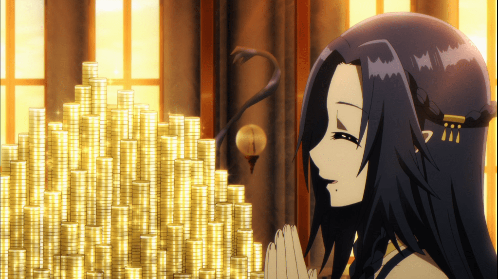 Using the humorous trait about Cid that was established in episode 3 about shamelessly doing “unwanted” activities for money, seems like it will be an ongoing theme. Interestingly enough, he had to sneakily steal the gold coins rather than just ask for it. It’s kind of a confusing situation to find out clearly Cid and the Shadow Garden’s relationship. Most likely, Cid is just embarrassed that he couldn’t come up with the money himself as Gamma just literally gives him the chocolates he asked for.