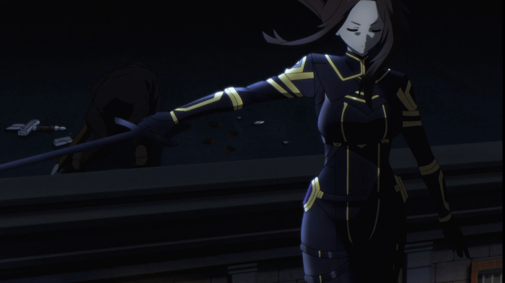 After leaving Alexia wounded and stranded in the alley, Shadow tracks down those imposters that escaped, taking a couple of them out of commission. Nu appears to applaud Shadow’s “quick-wittedness” in finding the fake Shadow Garden out. Nu busts out her Shadow Garden uniform and slices down the last fake Shadow Garden member, leaving him barely alive for interrogation. She states that “she is not as forgiving as Shadow.”