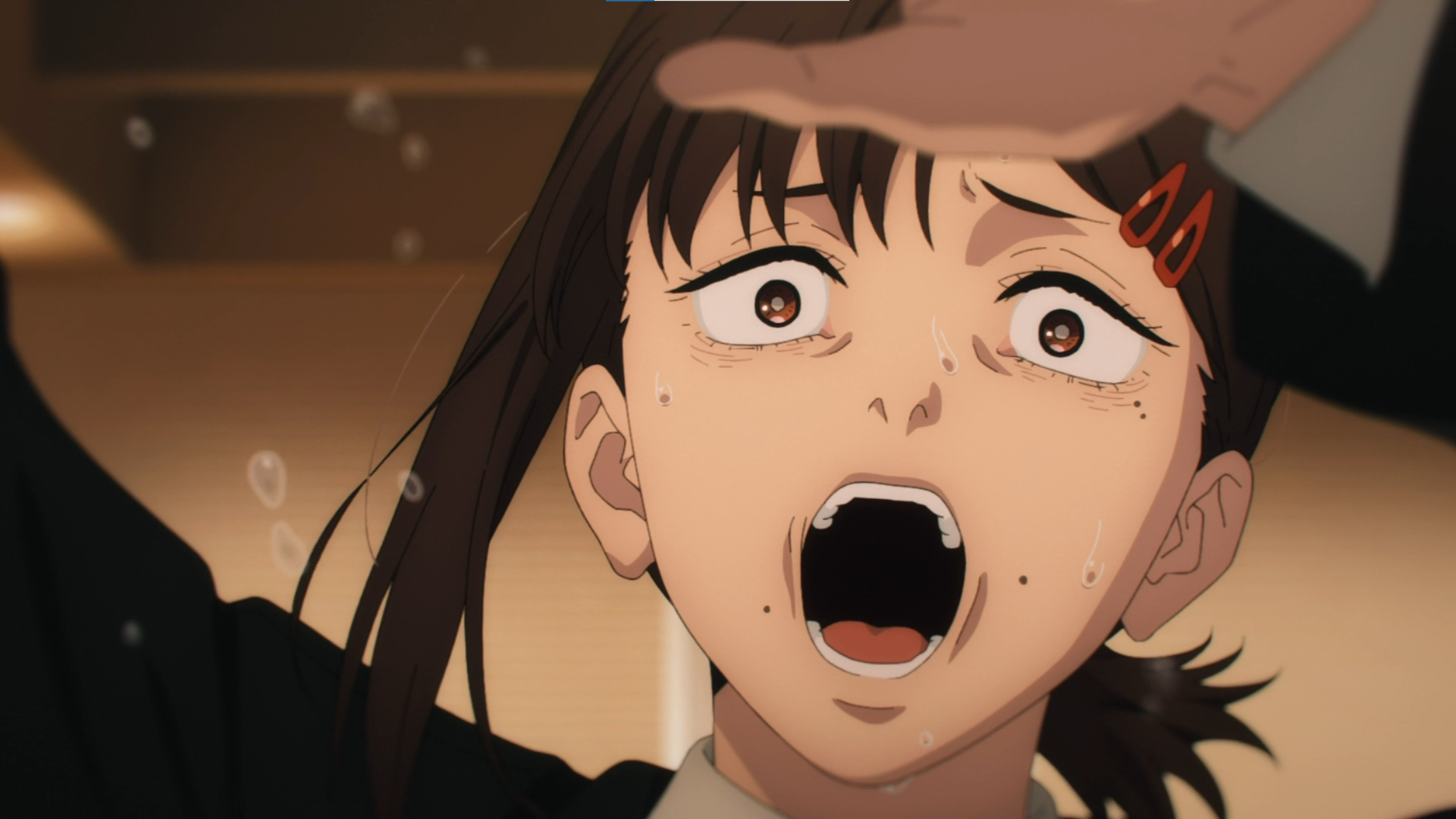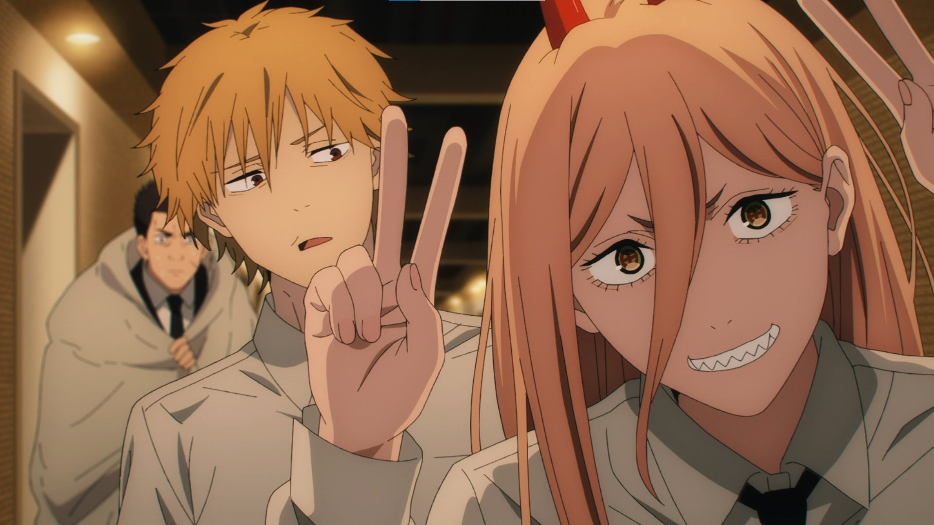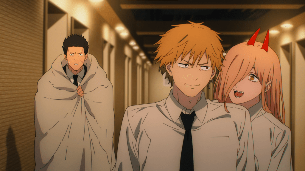 The previous episode left on the cliffhanger that Denji, Power, Aki, Himeno, Arai and Kobeni are most likely trapped on a specific hotel floor. It starts off with Himeno asking Kobeni to put 2 peace signs up as she tries using the stairs to confirm Arai’s suspicions that they are indeed trapped.