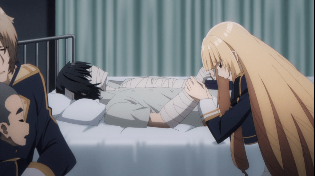 Onto the next phase of the episode, the scene shifts to all of the people recovering from the attack from the terrorists. Rose Oriana searches desperately to find the one “who loves her,” Cid Kagenou. He lays in bed heavily bandaged up like a zombie and has one of the most hilarious lines, “I’m dead.” With Po and Skel sleeping next to his bed, Rose Orianna cries while blushing bright cheeky pink for the handsomely bandaged Cid.