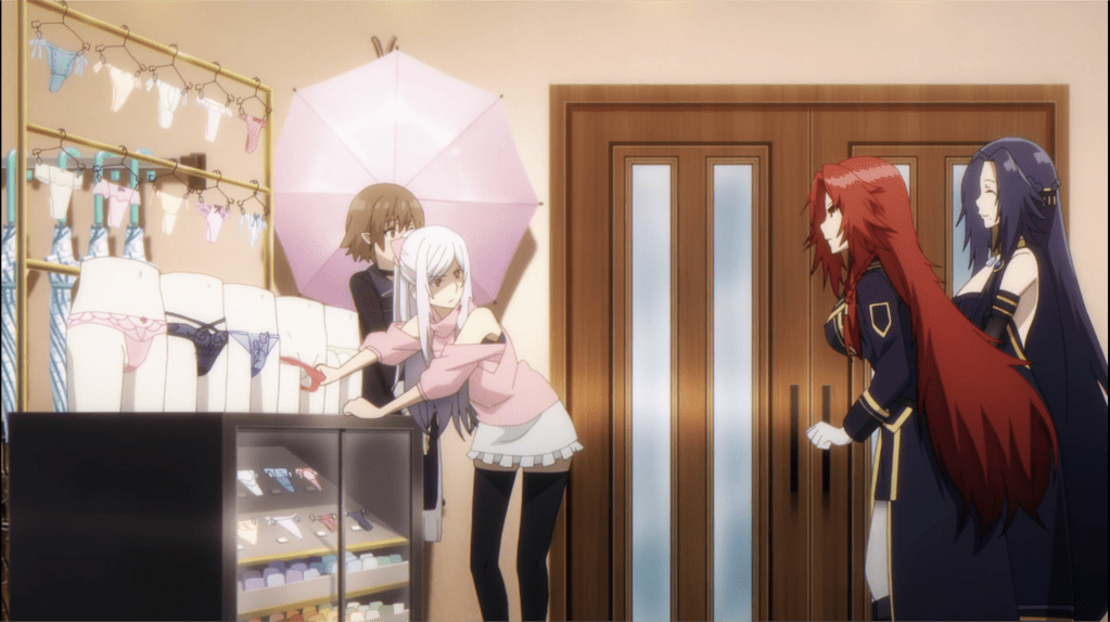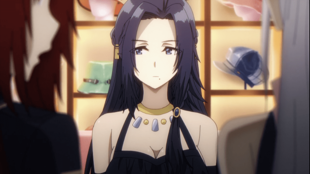 For the purpose of “heading to the Sacred Land as a special guest for the Goddess’s Trial, “Alexia and Iris end up shopping at Gamma’s mall, Mitsugoshi, for the special event. Gamma walks in and introduces herself as “Luna.” FOr the aim of gaining intel on the “corruption and missing orphans” referenced by Nu in an episode prior, Alexia plans on schmoozing up to the archbishop using a little bit of wink, wink, nudge, nudge.