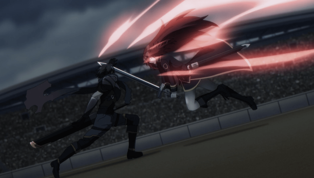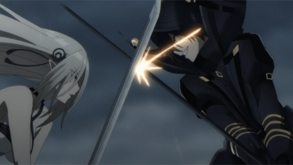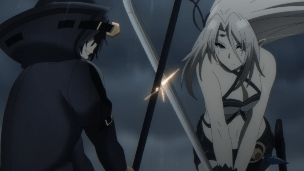 Beatrix clashes swords with Shadow as epic music starts playing in the background and the animation starts to ramp up. With the rain and thunder teasing the audience for this epic matchup prior to the episode, their fight takes to the roof, where the battlefield is pouring rain and thundering in the background as the screen goes white for the cliffhanger.