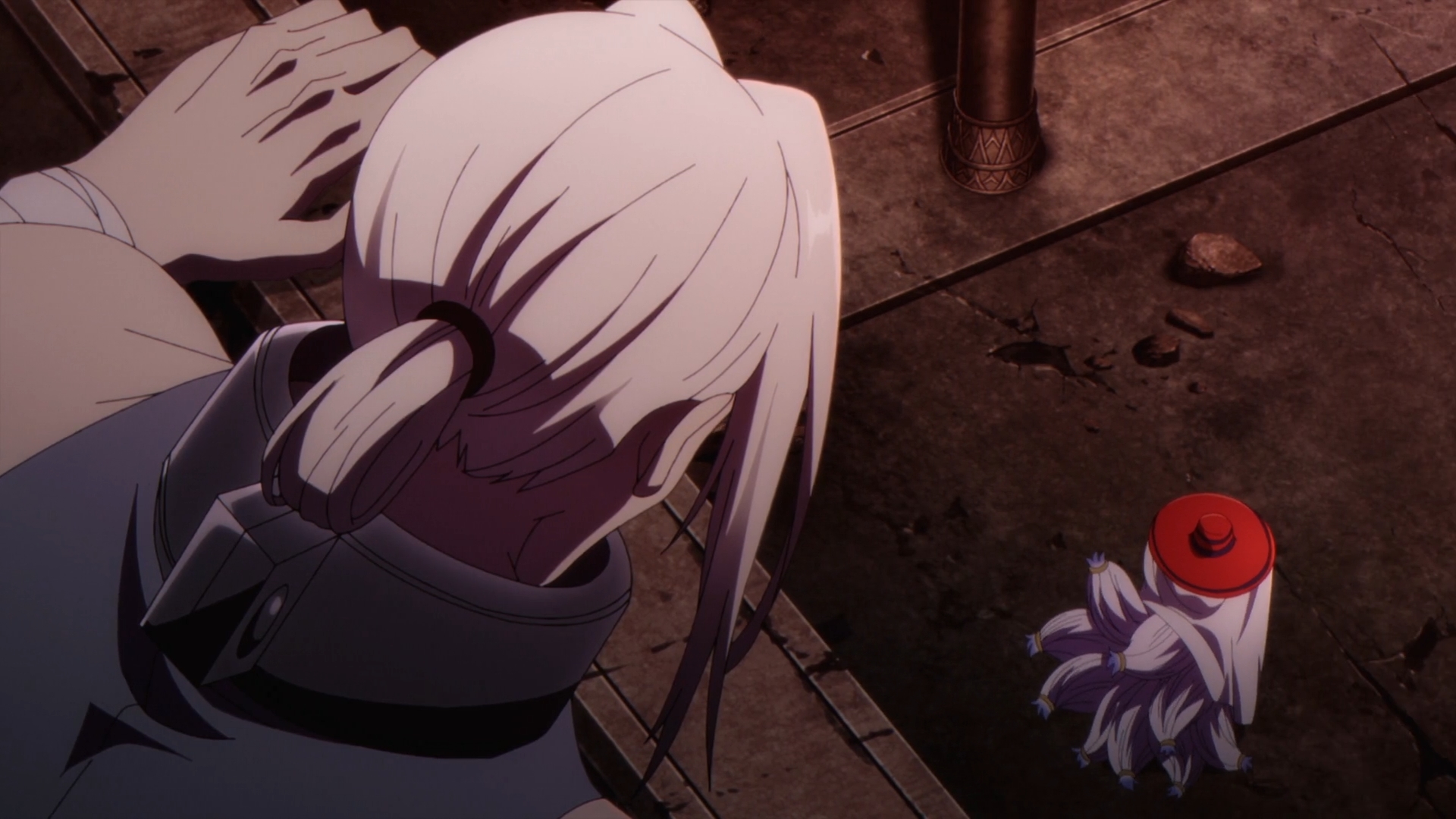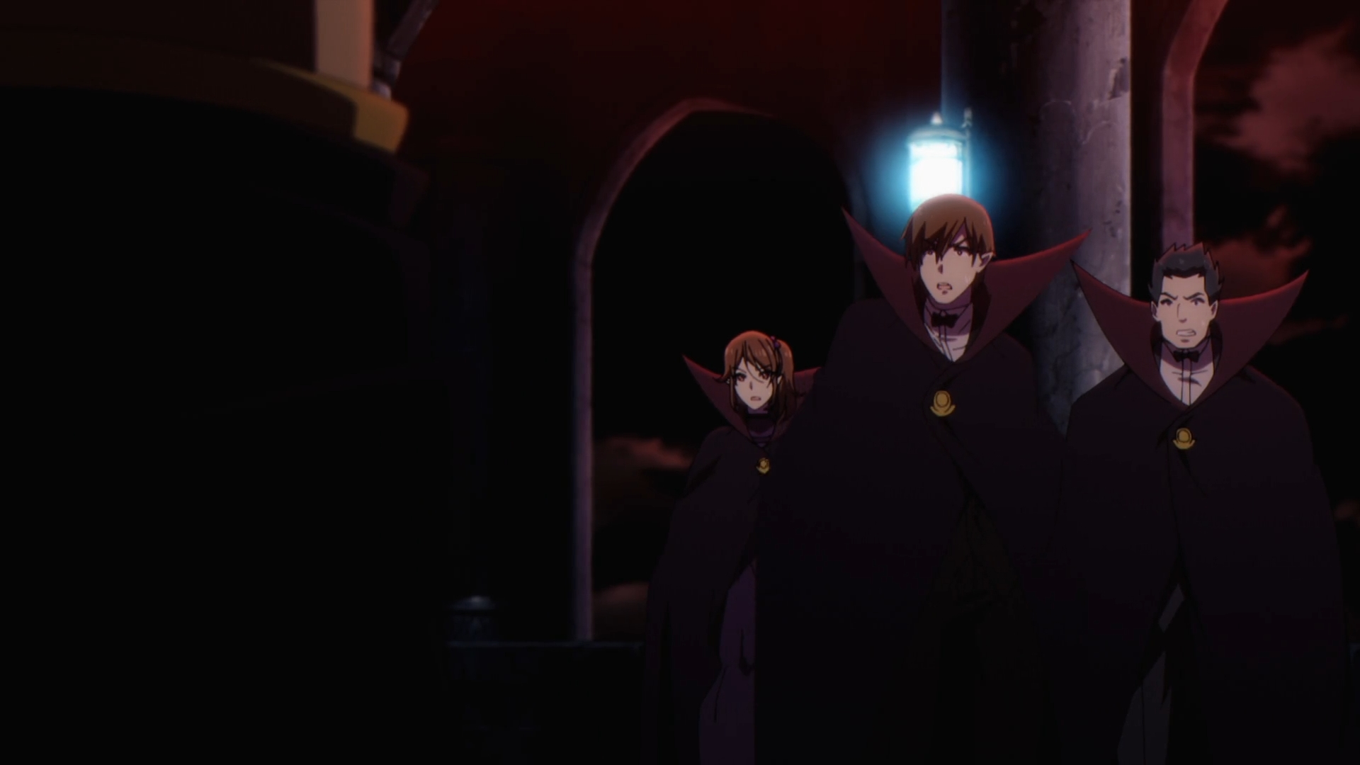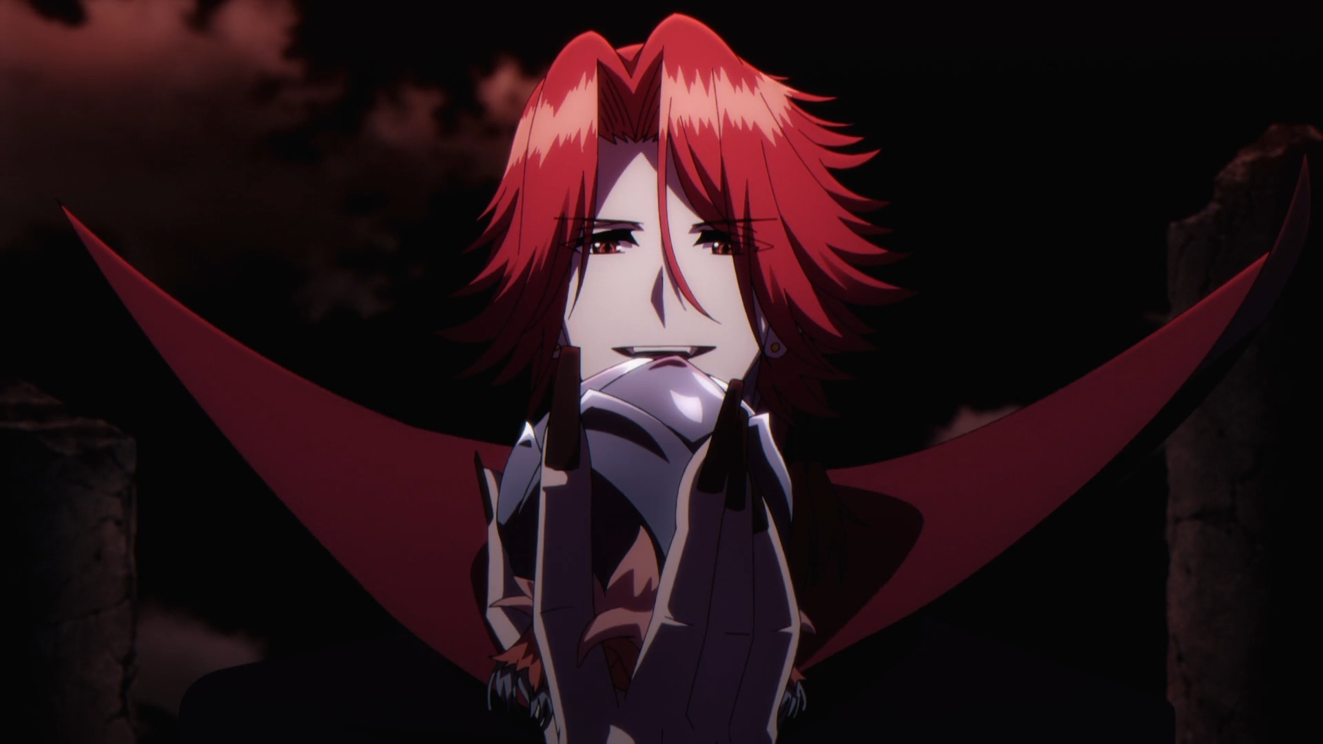 In the one of the last scenes of the episode and possibly of a very short arc, Crimson acts out one last antagonist trope. It’s the big reveal! He takes out Queen Elisabeth’s heart and inserts it into the body of a person who looks just like Cid to revive her, except Shadow steps in just a tad too early to blow up the bad guy. As the dust settles in the rubble, he drops the classic tags one last time..