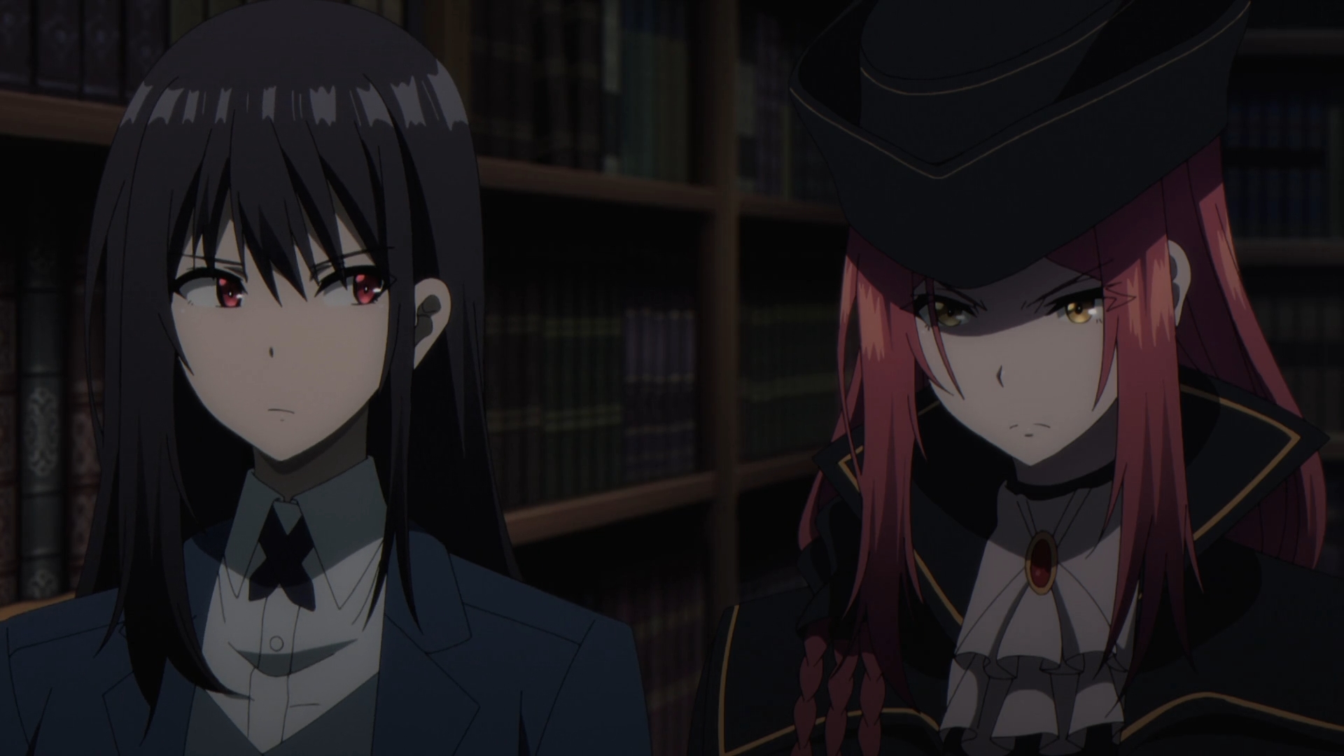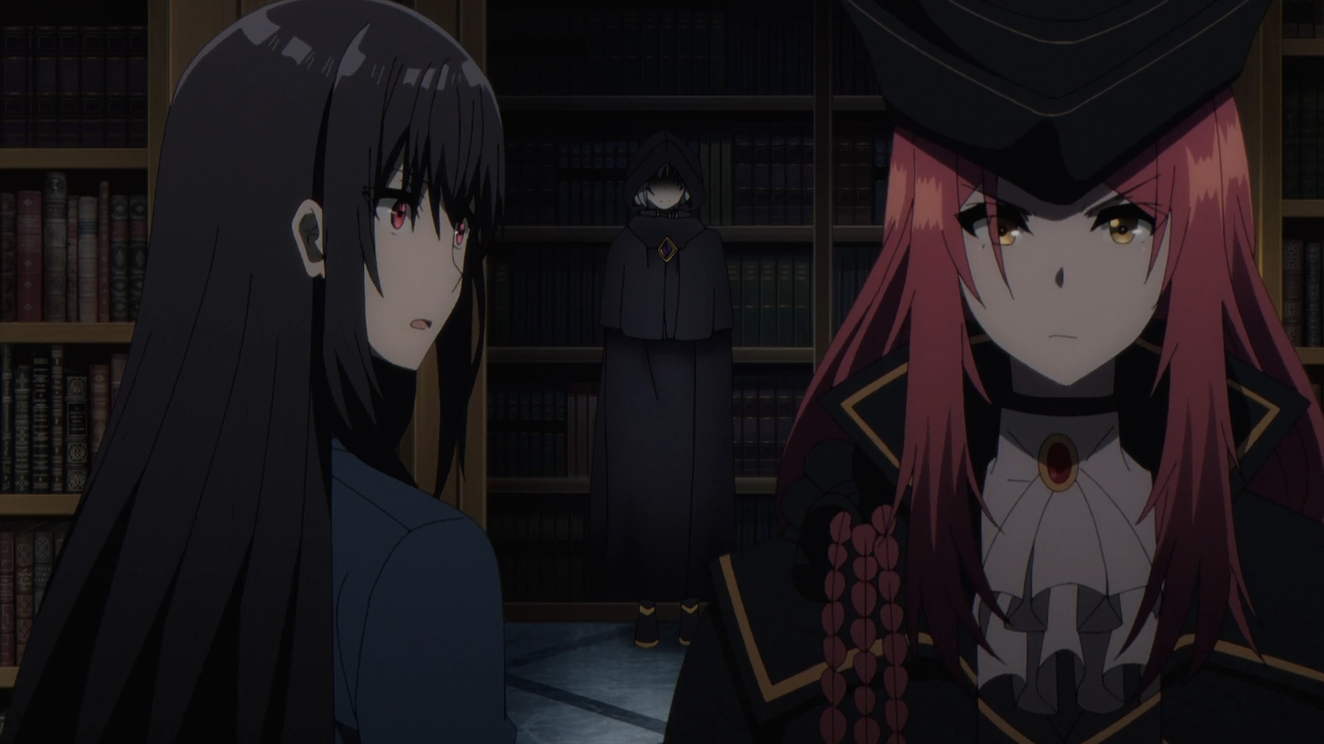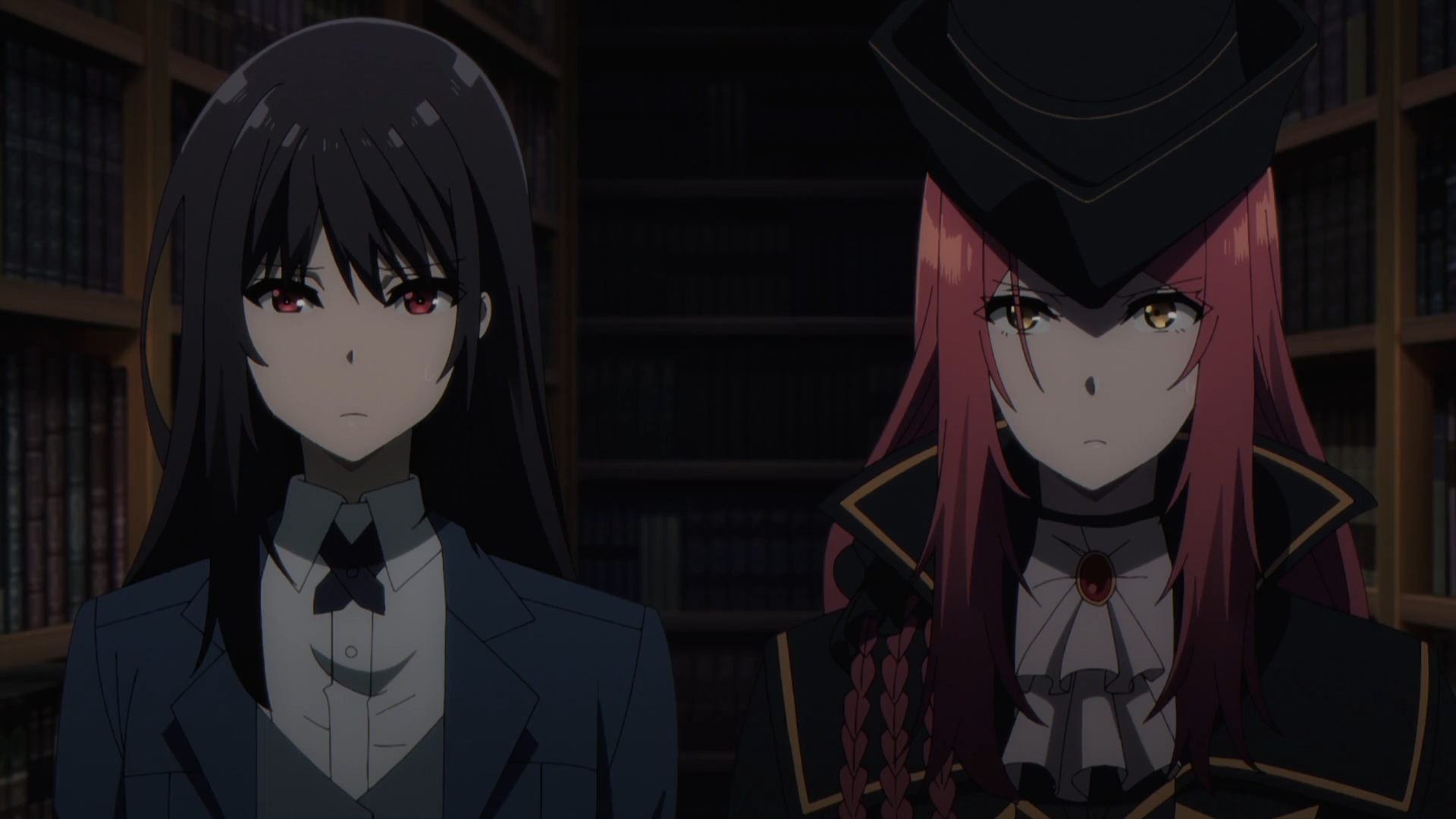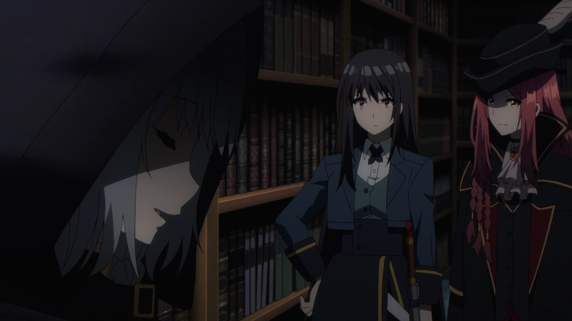 As Beta engrosses herself in the book, we are hit with a funny thud of a scene as Claire and Mary fall comically into the library on top of each other. We’ve seen a funny entrance like this when Alexia and Rose went into the portal at the Goddess Trials and landed on top of Natsume. Because Shadow Garden has their own alter ego aliases, we get to see Natsume play as this stern super intimidating character, Beta; stating that she should be ‘eliminating’ anyone that comes in contact with her and Shadow Garden. Of course, having Claire Kagenou present of complicates the matter.