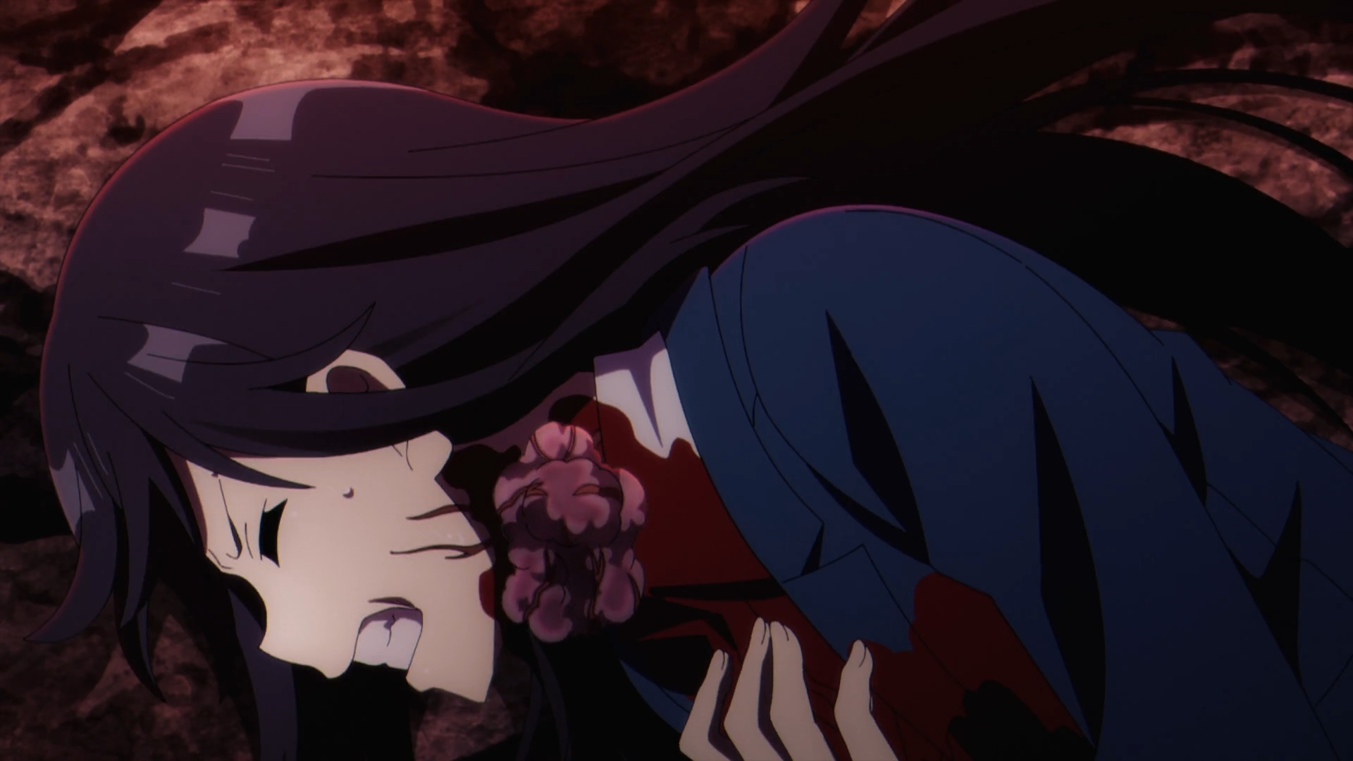 A battle damaged Beta recognizes how their situation has gotten dire. The queen is using their blood to perpetually get stronger. Then, she commands Rose to leave with Claire. Before everyone can get away with Beta taking the lead, the Queen does something inexplicable. From the previous episode’s foreshadowing, Beta’s study of the connection between the progenitor vampire and the demon’s ancestral background becomes fact as the Blood Queen unleashes a terrible power that causes the demon possessed blood to start taking over Shadow Garden’s bodies—causing Beta’s trauma to surface from such a horrific event. This has effected everyone, including Claire whom Cid had helped fix the demon possessed within her.