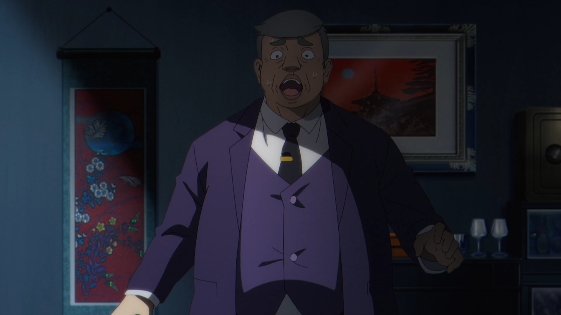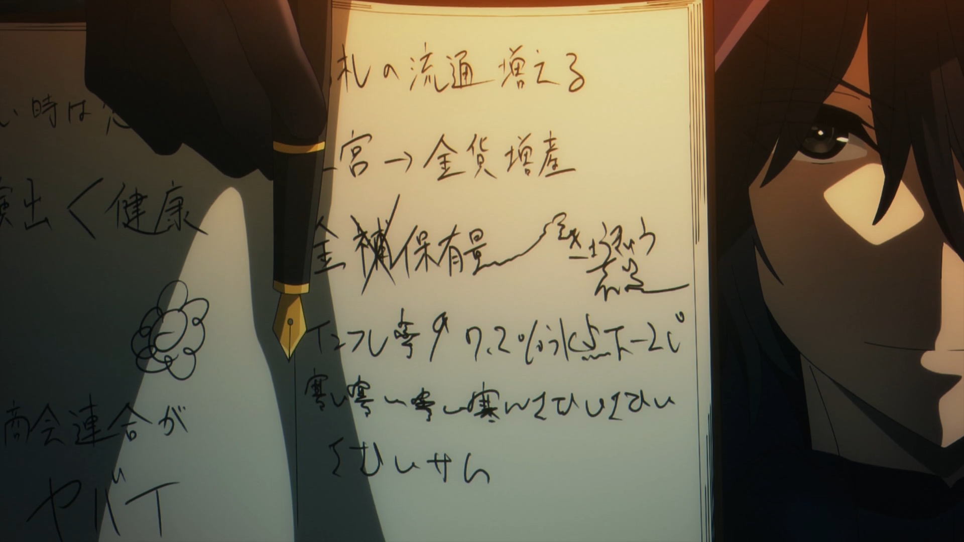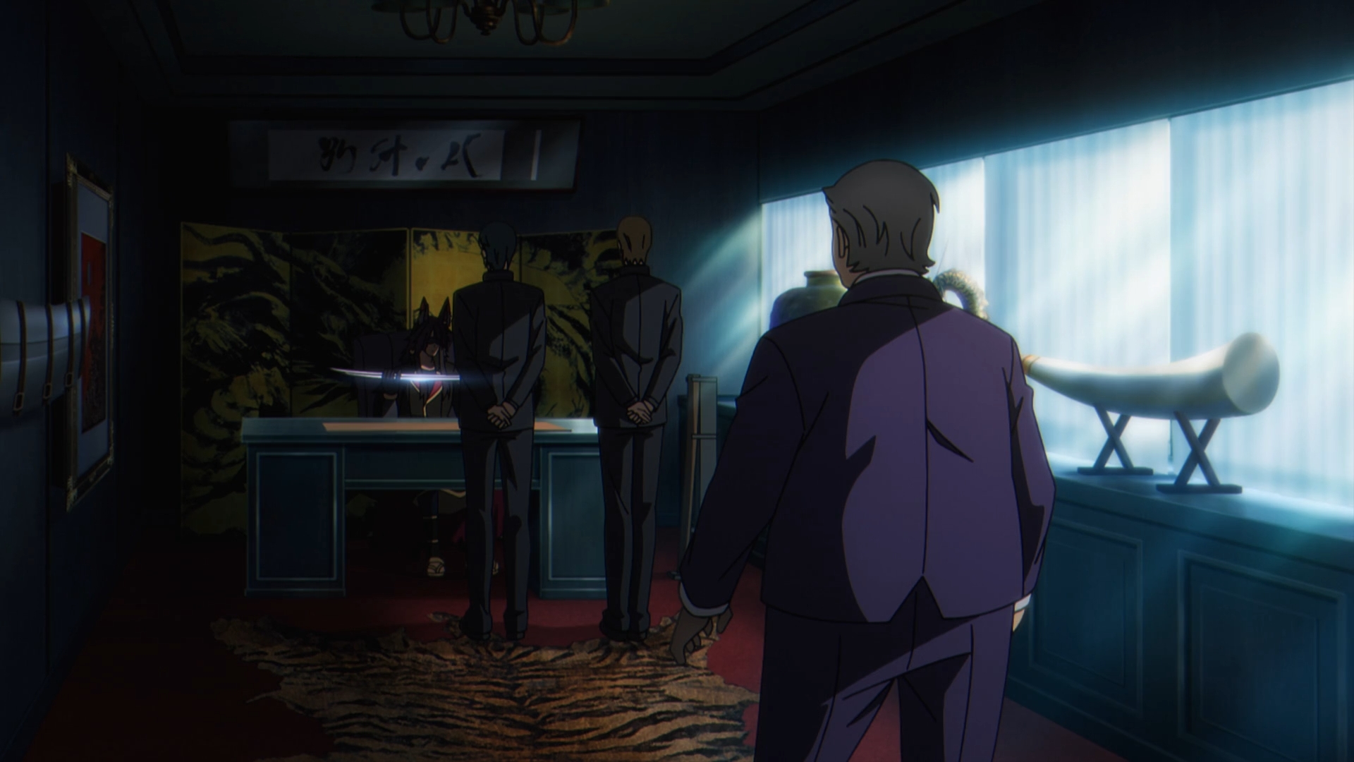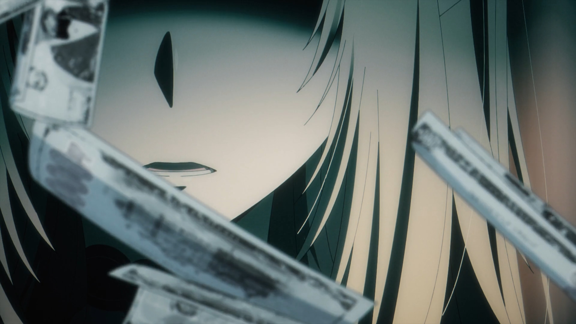 Gamma reports to Alpha about Delta. She presents to Alpha with a bundle of Delta’s hair, crying. Alpha reacts distraught. She continues the orders to keep ‘searching,’ breaking the glass in the process. Gammas continues to mention that the counterfeit bills have become such a big concern that it’s pressing everyone to the brink, including Mitsugoshi. Alpha explains it all with the credit crisis being the real goal, taking down every business with John Smith taking it all for himself.