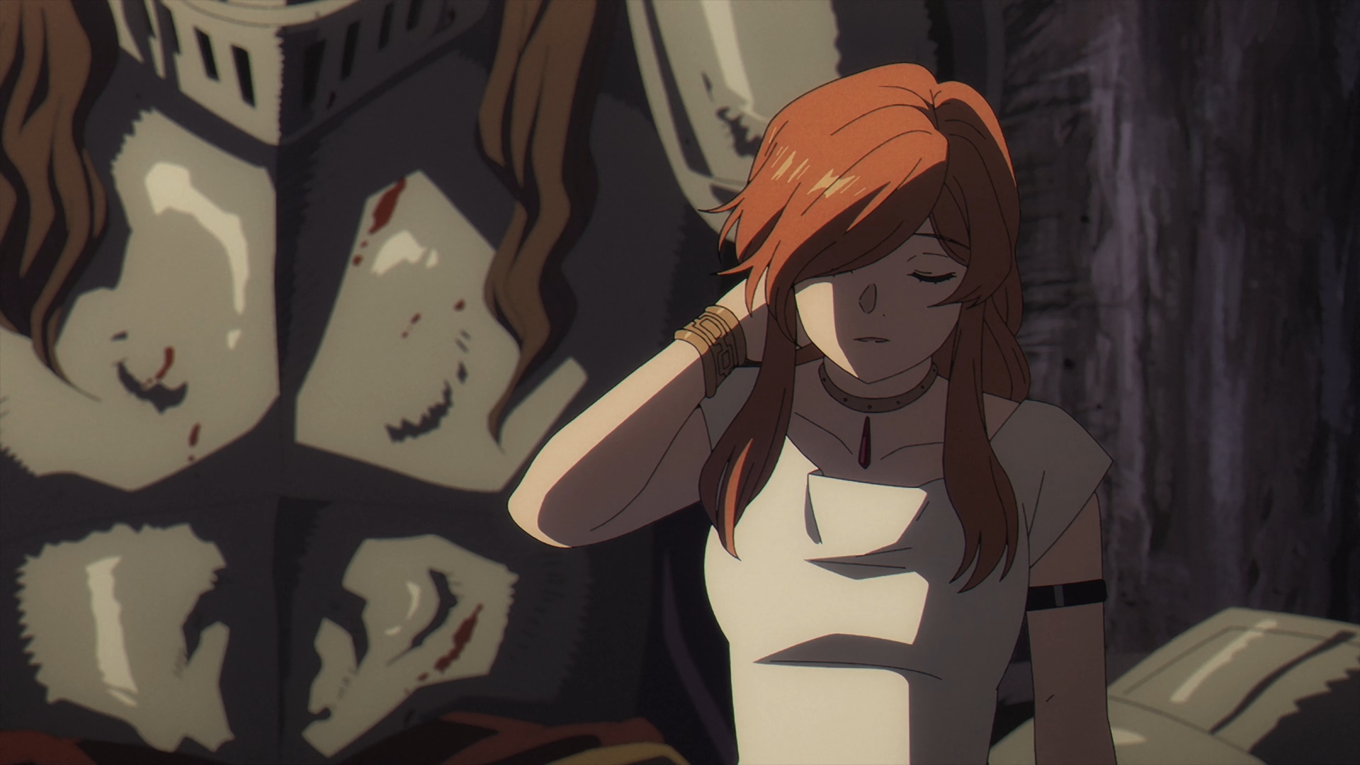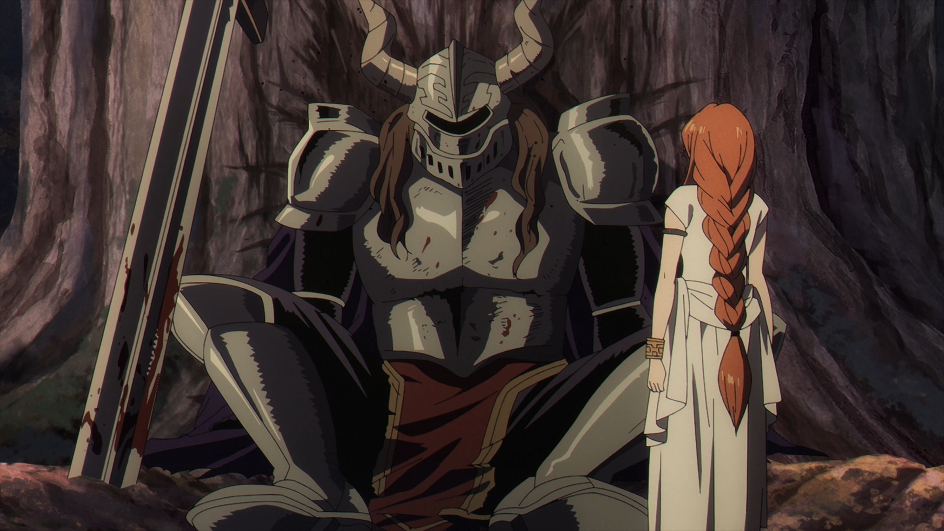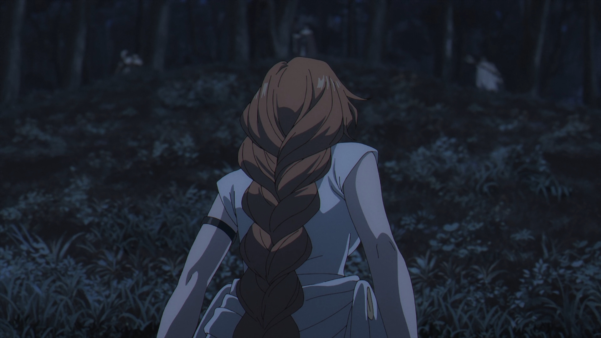 It flashes back in time once again with Flamme walking through a massacred elf village. Flamme mentions that Basalt the Throne, one of the Demon King’s generals is responsible for this, as he lies lifeless against a tree. Turning around, Flamme seee a young silver haired elf with a massive amount of mana, who she assumes is the one that helped defeat him.