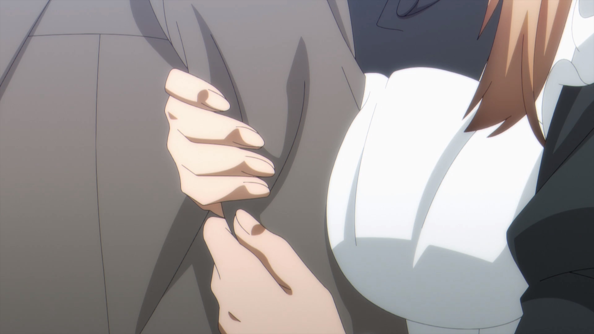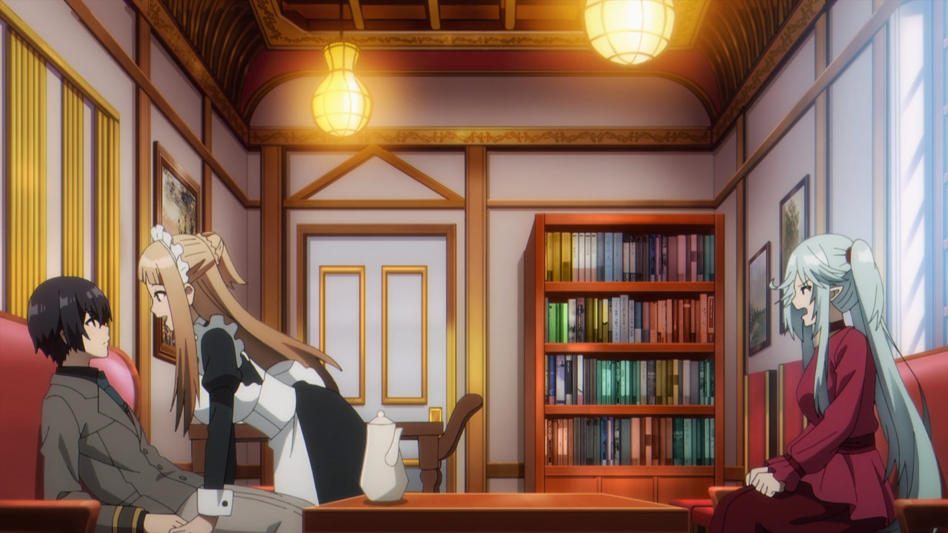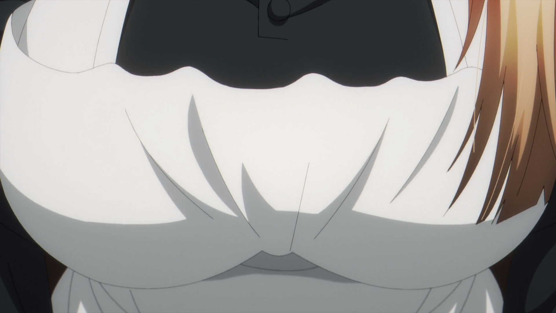 Margaret gets progressively more insistent in being Cid’s guide as Shiron gets more and more frustrated. As her chest gets closer to Cid, he capitalizes on the “99% slime content” joke earlier, by referring to the maid’s as “0% slime content.” With that punchline to the scene, it shifts to Cid walking with the maid, Margaret.