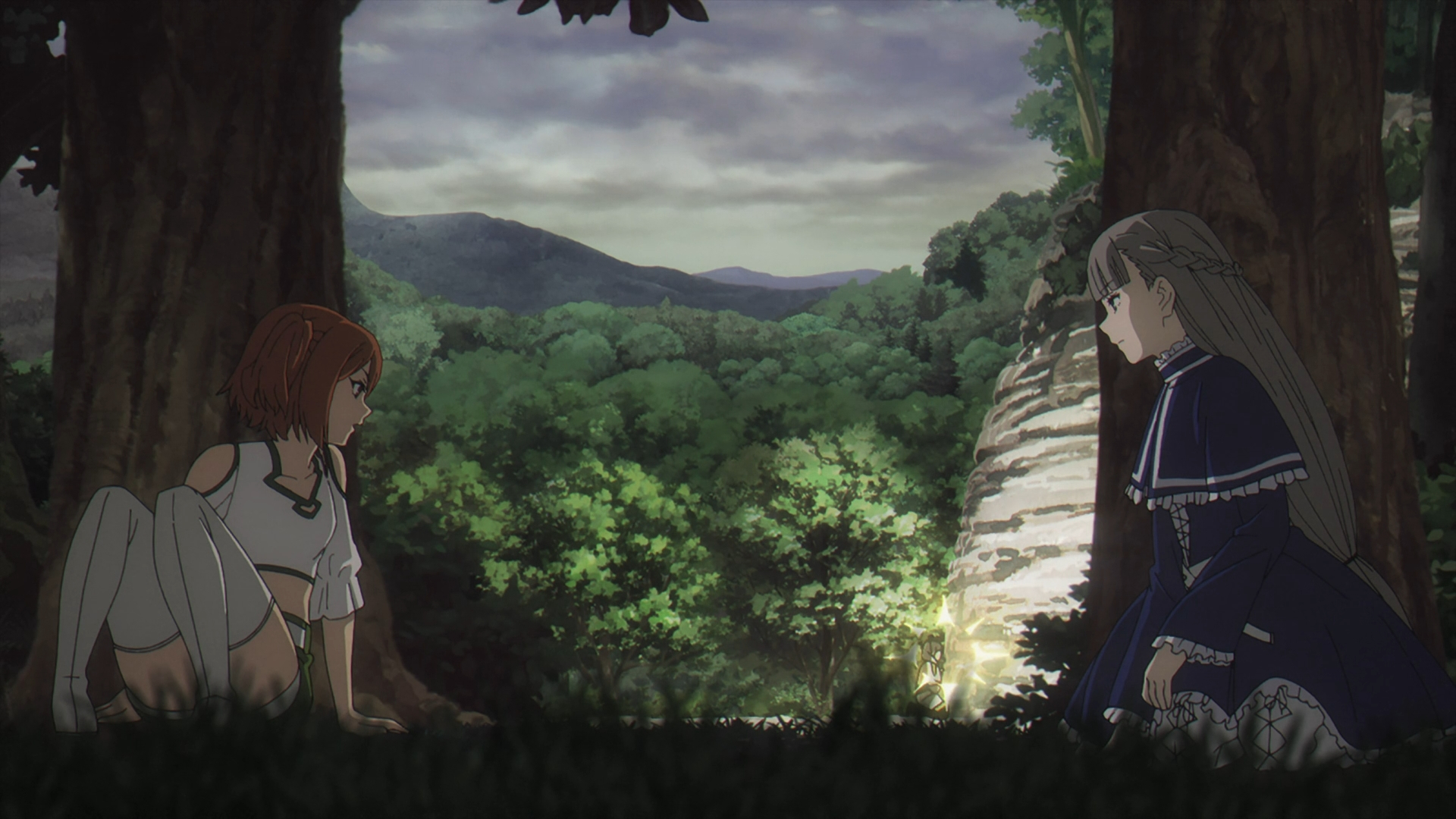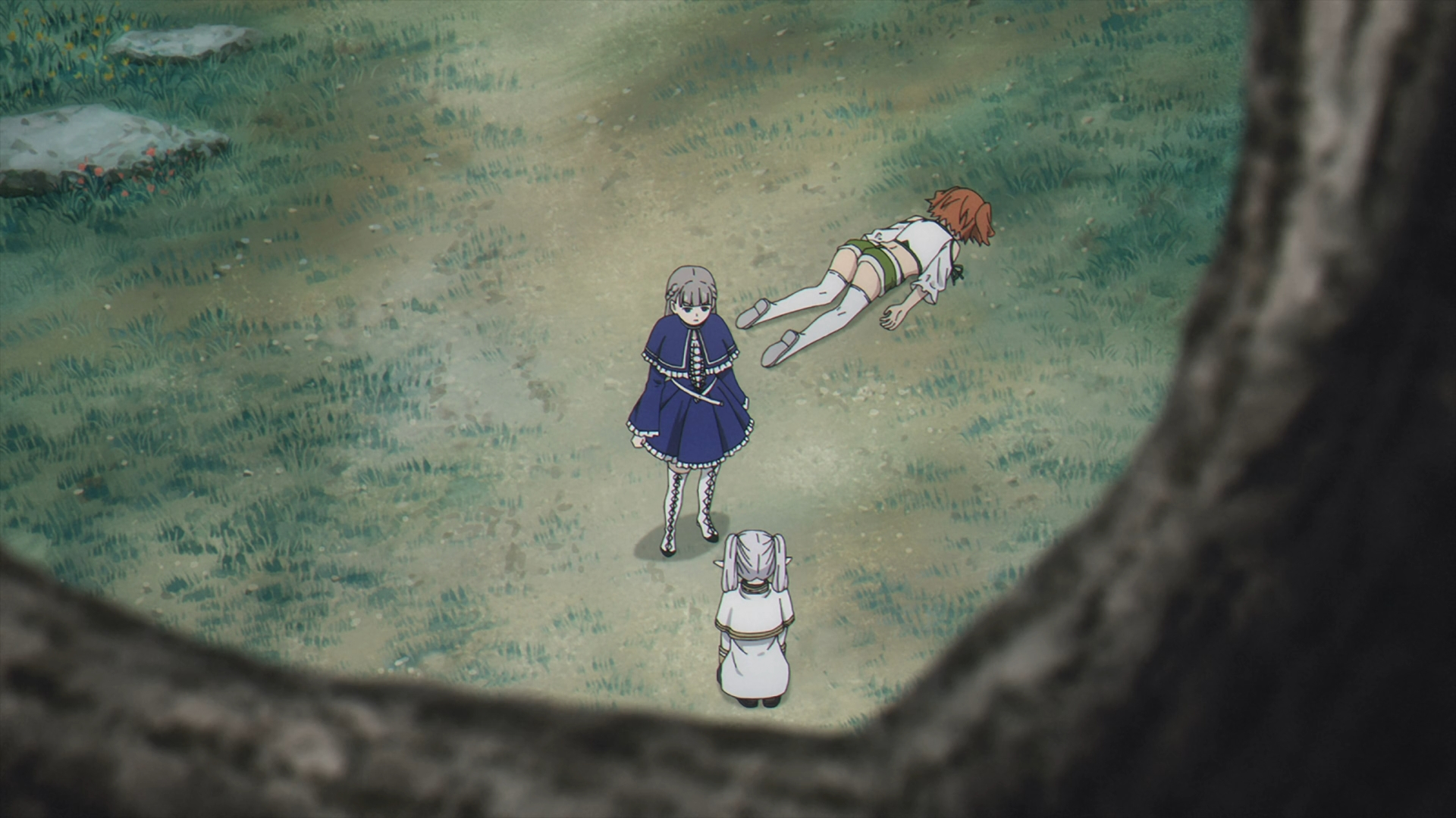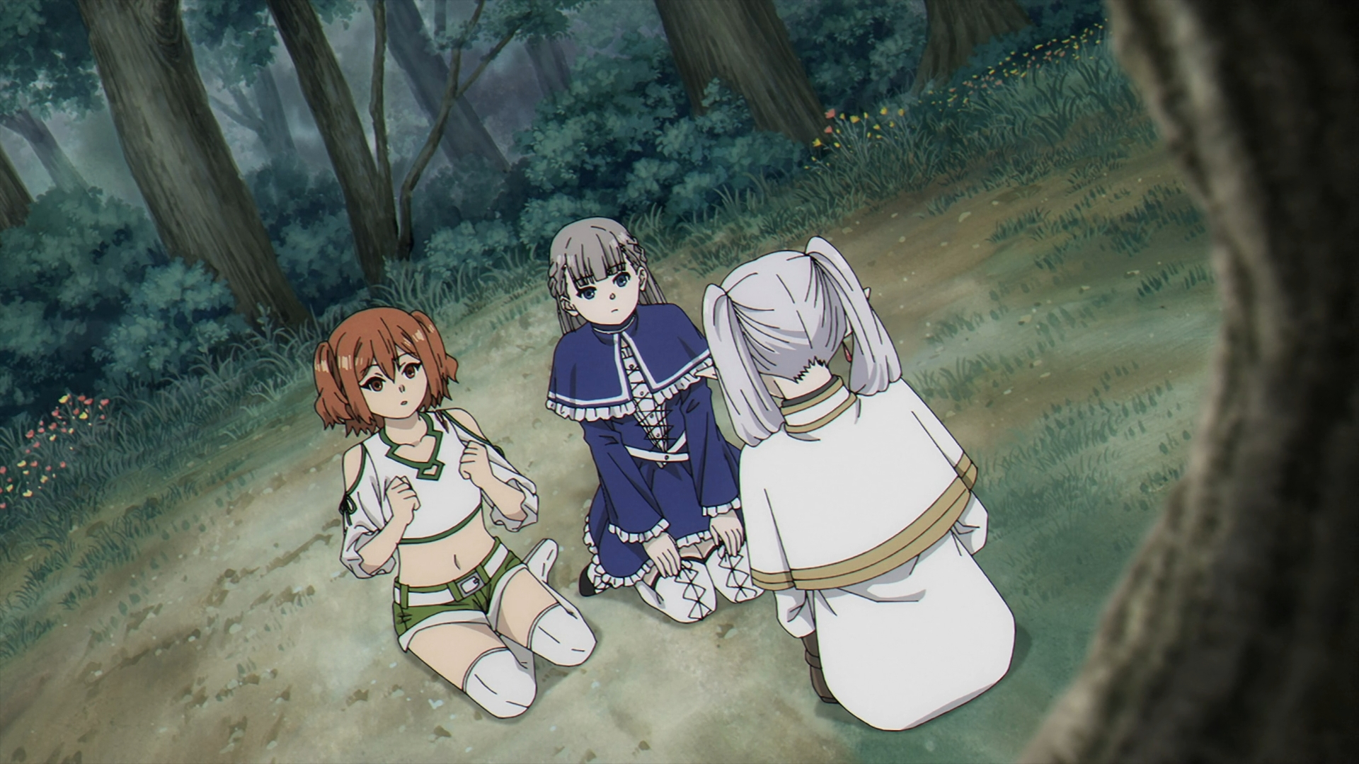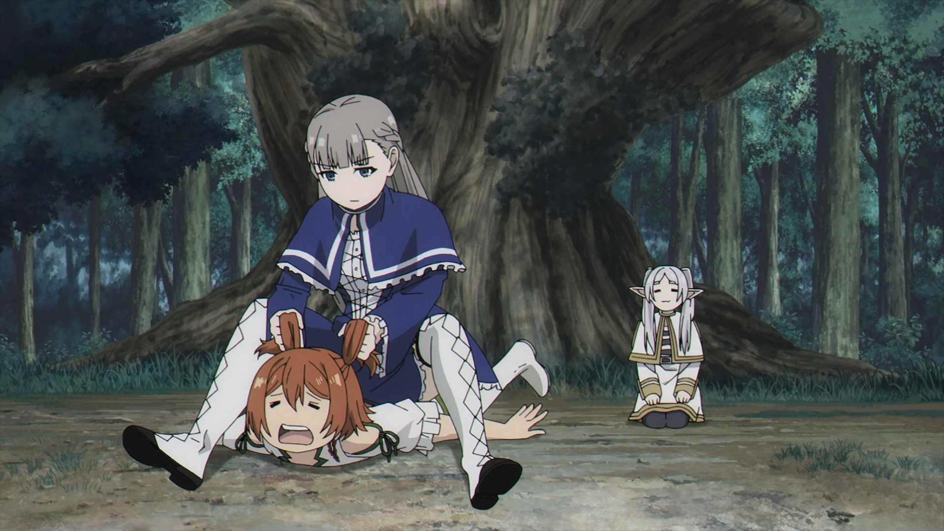 Once the montage ends, Lawine reveals the risk in “picking a fight with other teams.” This continues setting up the foreshadowing from Fern & Ubel’s scene from earlier. Kanne asks if Lawine is ‘scared’ and Lawine answers with comedic relief by getting on top of her and pulling her hair. It looks like the stage is set for some 3 on 3 fighting with an endless amount of possible misdirection.