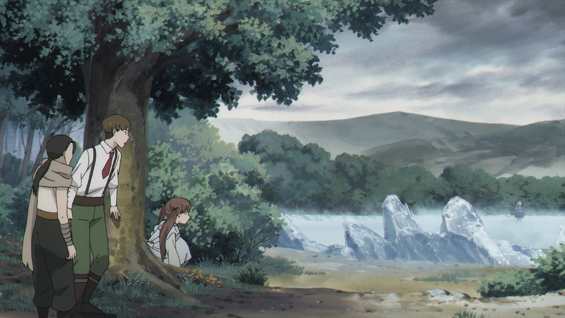Kanne comes running back to Frieren to tell her that all the little ponds that she can find have a little bit of her mana in it. This dwindles the number of spots that the Stille will show up. Frieren stays pat at the water pond and suppresses almost all of her mana as Kanne & Lawine go hide.