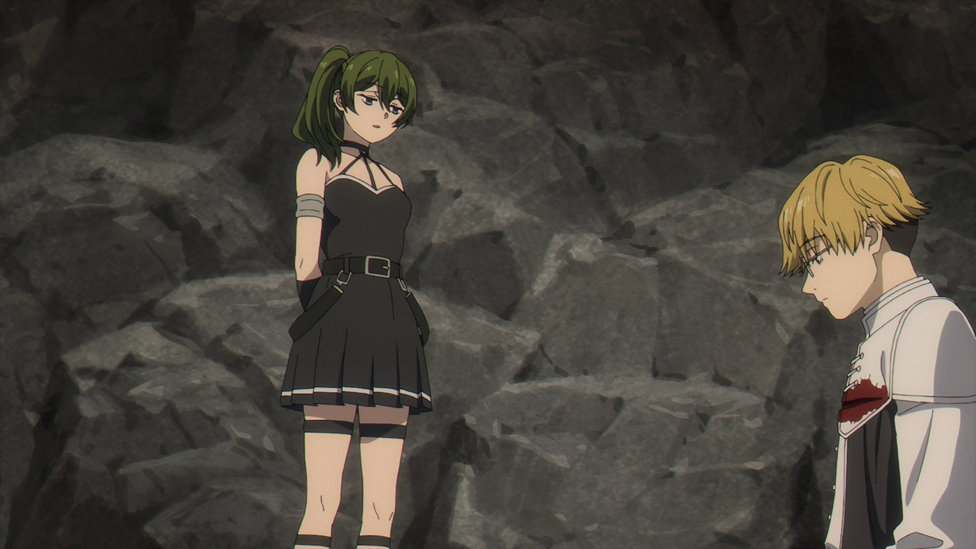 As Wirbel, Ehre and Scharf are fighting against their replicas, Wirbel is confident in how they can beat the replicas of themselves. He deduces that Ehre’s mana would outmatch Scharf and his. The replica Ehre starts raining down shots from the ceiling with Wirbel matching its attacks. He reveals that he is fully confident in being able to defeat the replicas “no matter the opponent or situation,” as he blasts a big hole in the ceiling.