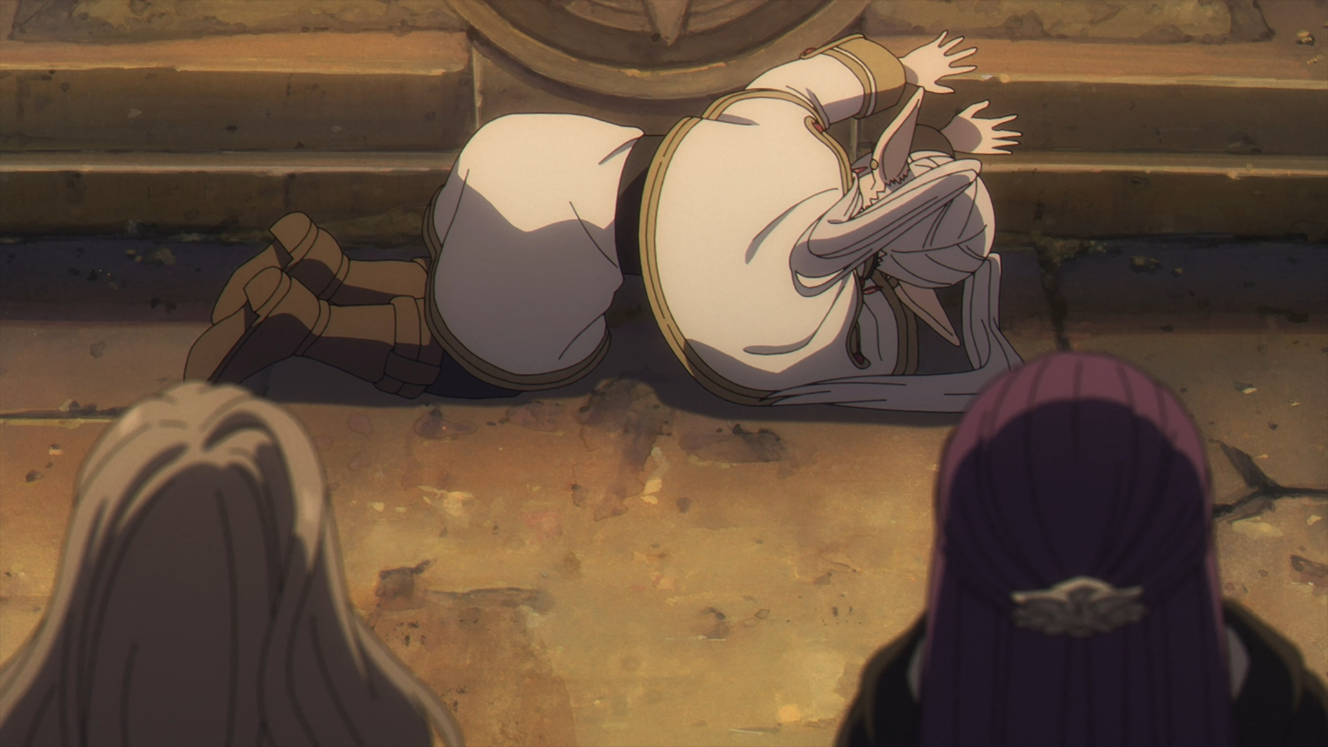 The opener is just a recap of what happened at the cliffhanger in the previous episode. Wirbel, Ehre and Scharf come across their 3 exact replicas, whom Wirbel confidently pointed out who each one of them will fight against. Denken, Laude, Richter & Methode just wrapped up their battle an exact replica of Laufen, in which Methode concludes that a monster or demon is likely the entity behind it. As they reach the end of their destination to enter the very last gate, it is none other than the clone of Frieren, waiting for their arrival.