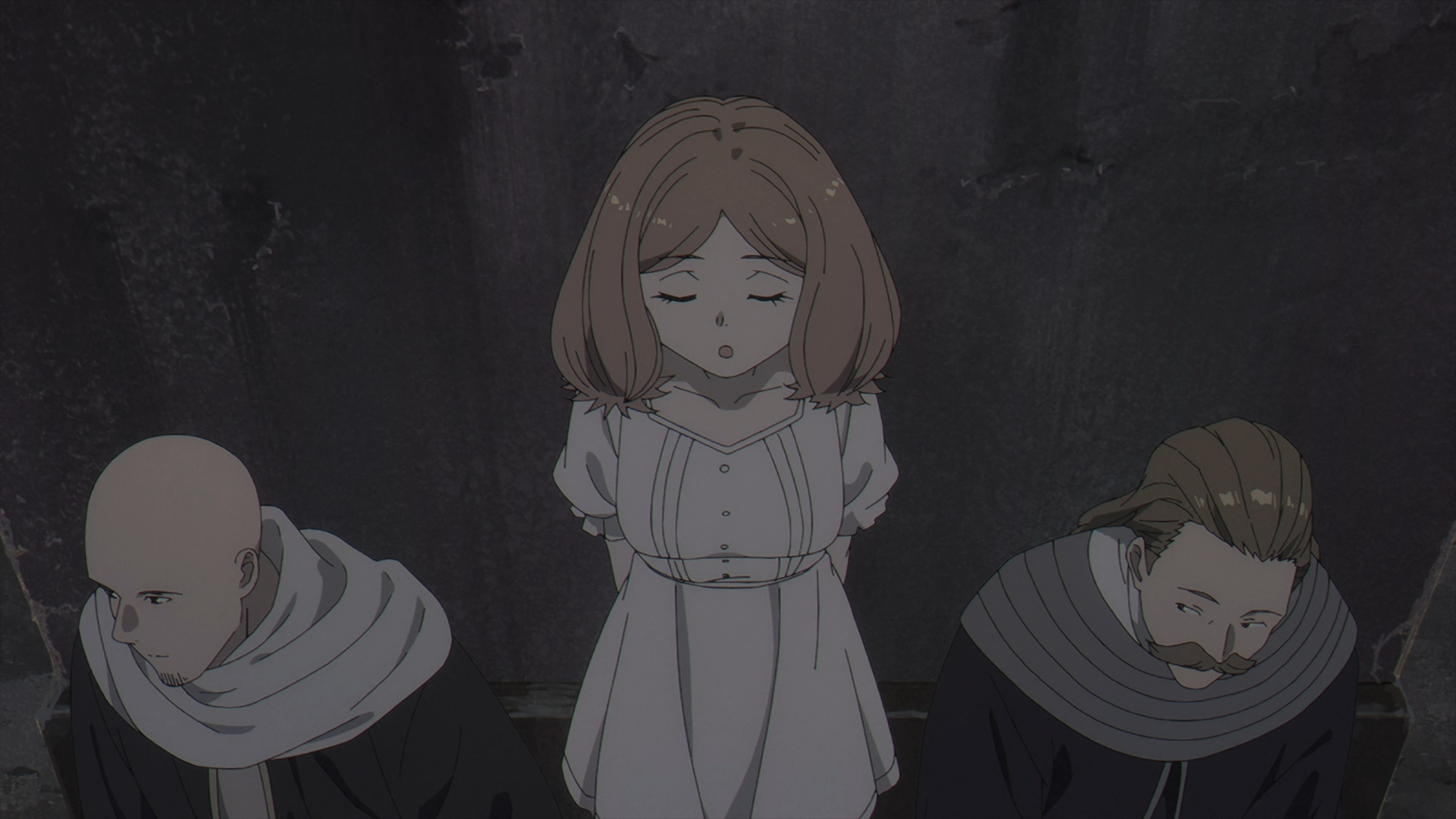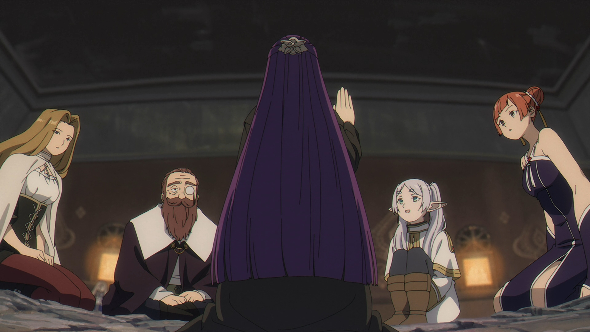 Denken has Methode try her resistant magic on Frieren, but as Methode hugs Frieren to use her magic, she states that Frieren is completely immune to it. Comedically, Frieren can’t help but point out how wonderfully Methode smells as her face is pushed against her chest. Like a disappointed mother, Fern puts on her face of disgust. Next up, Methode tries some hypnosis spells and asks Frieren to “look into her eyes.” Just like Frieren said earlier, she is resistant. Fern annoyingly pulls Frieren back from the hourglass Methode. Methode explains that Frieren’s “mental defenses is complex and old” and that only someone that specializes in hypnosis magic can get past it. This brings up the capabilities of the other participants, dwindling down to someone named, “Edel.” She explains further that she has “no combat abilities” and is skeptical about her abilities to even make it this far. Still, they are not even sure if hypnotic spells would work on the replicas, since it’s not guaranteed that they would have minds to control.