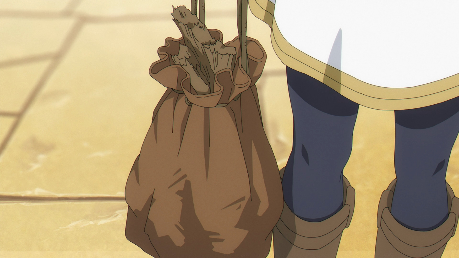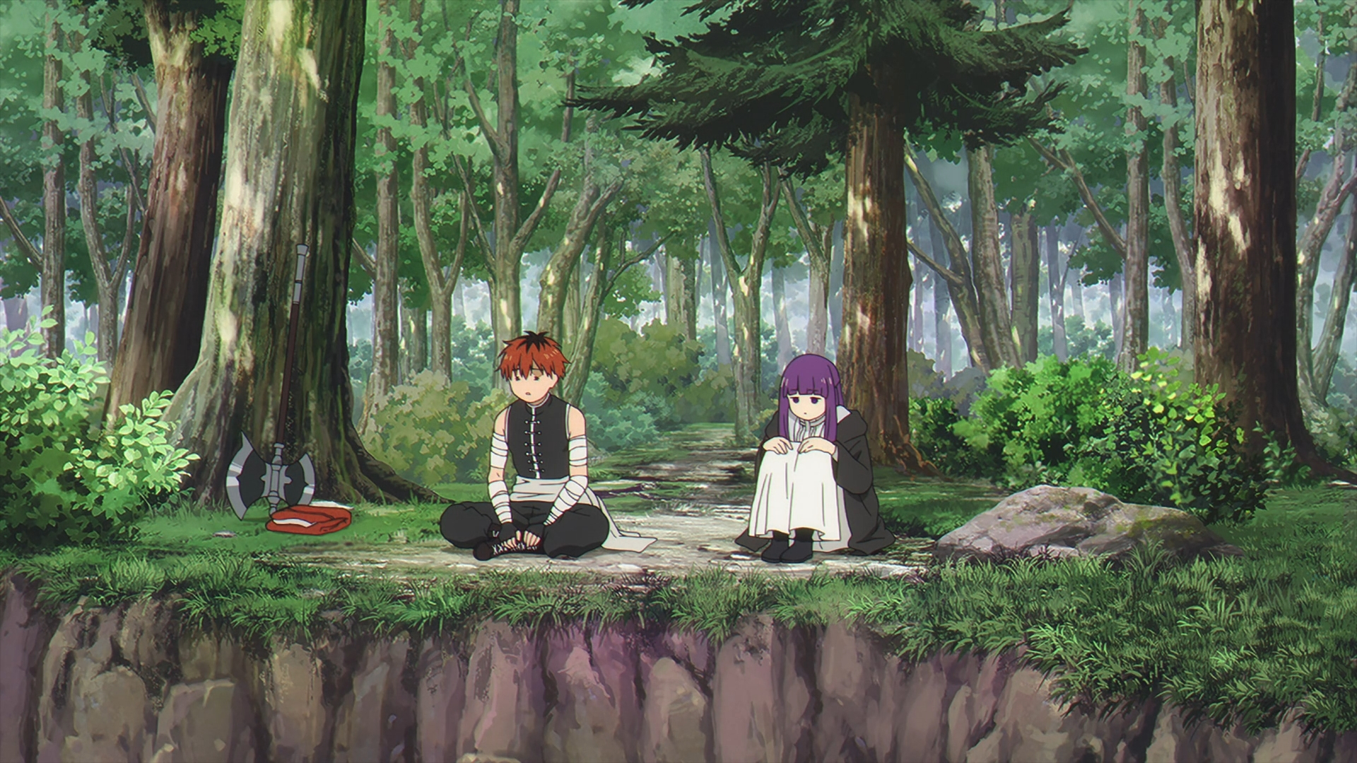 With Kanne and Lawine excitedly run up to Frieren and notice her carrying a bag full of Fern’s pieces of her staff.