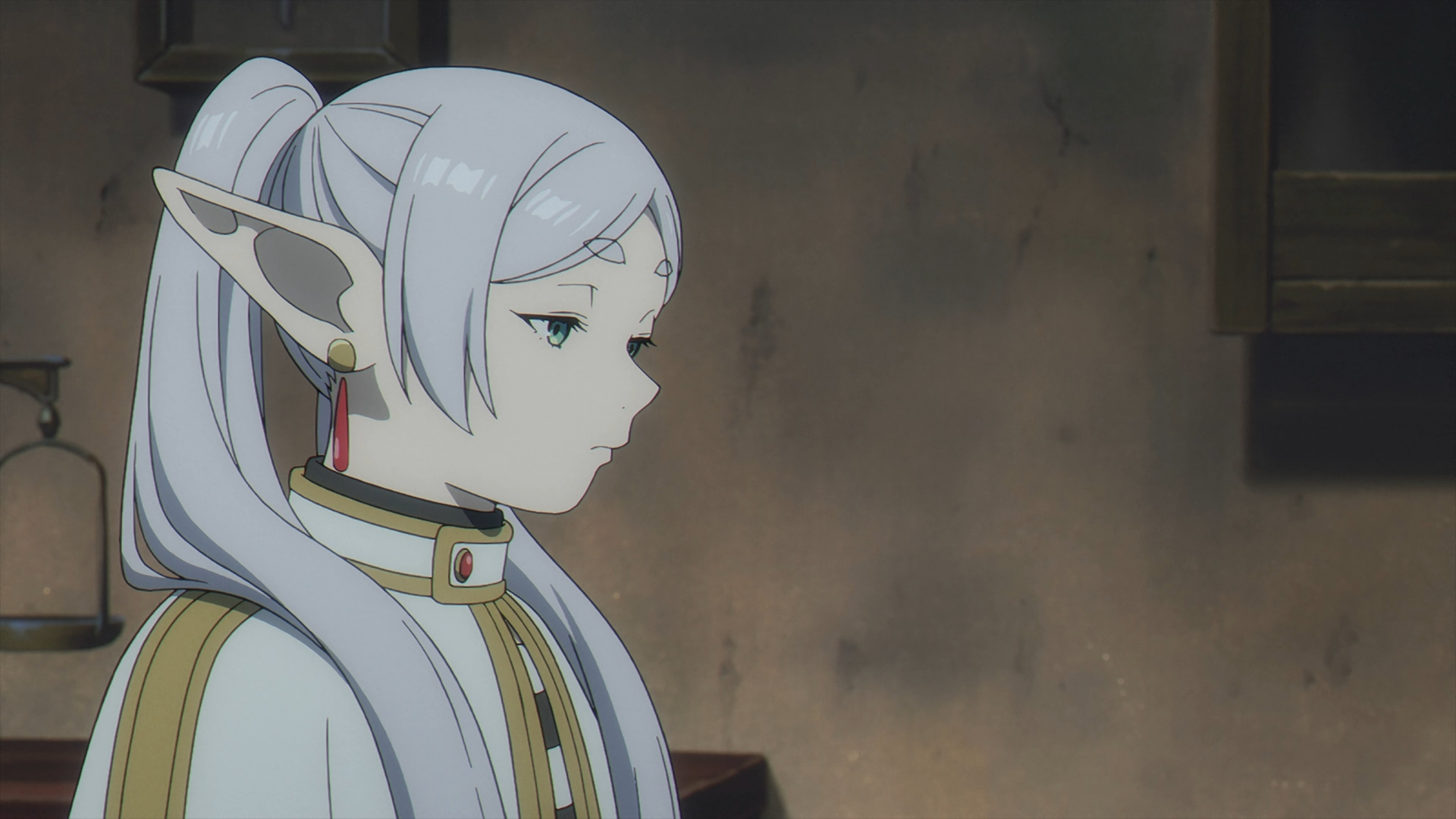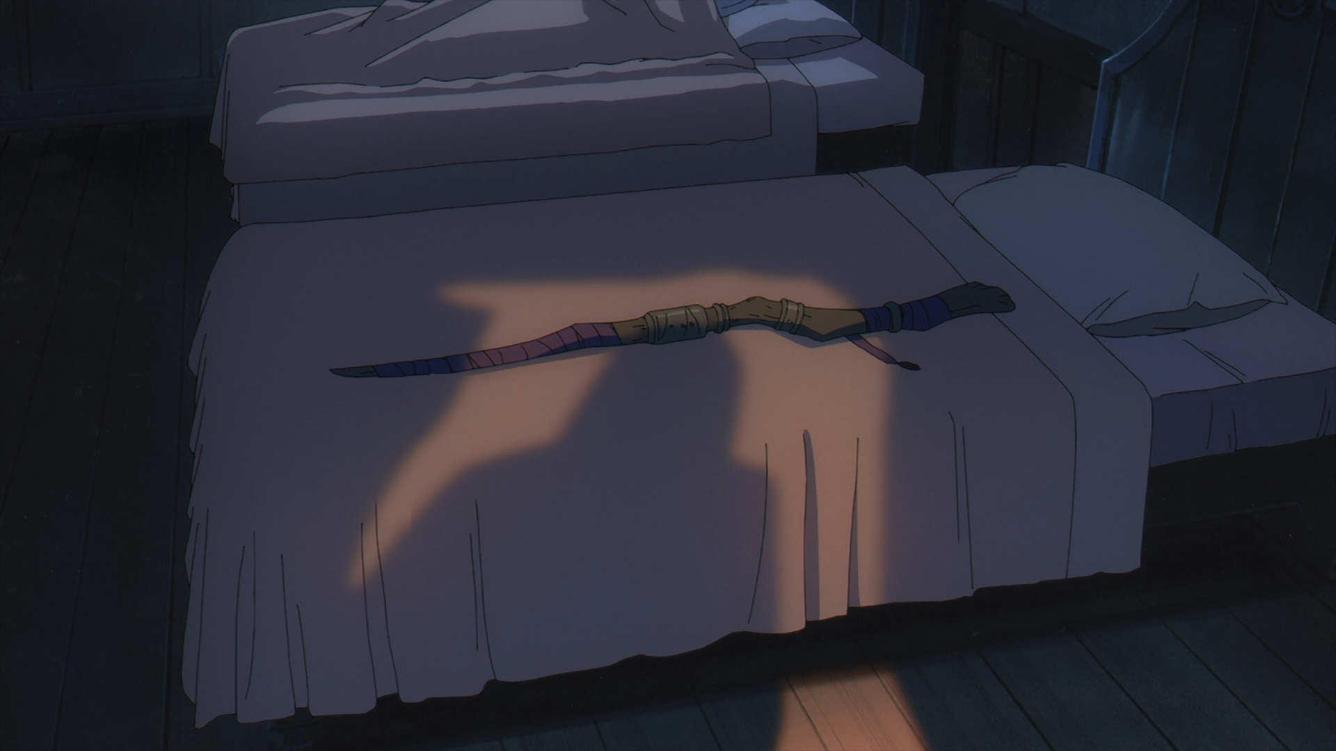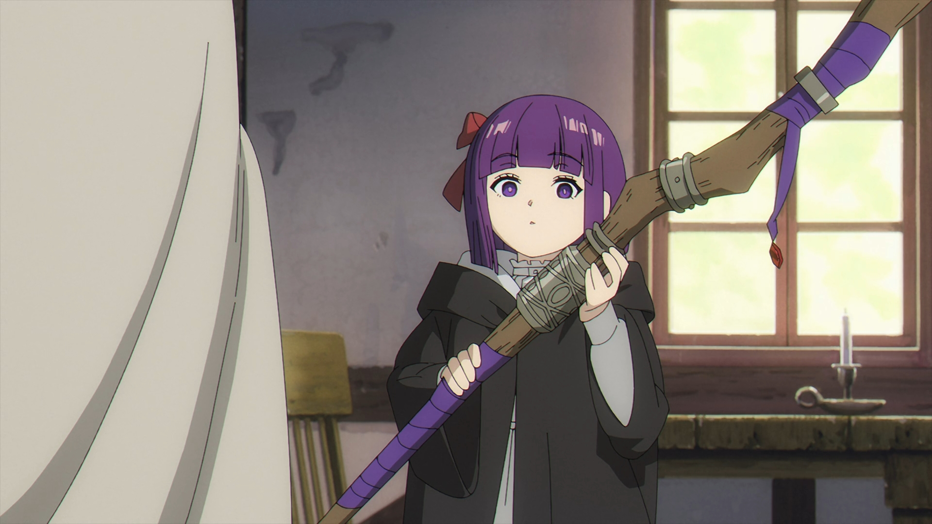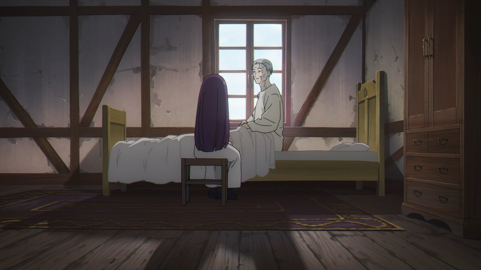 Once Fern gets back to the inn, she finds her staff on her bed all back in one piece. She looks over to Frieren sleeping in the other bed and this sparks a flashback with Fern speaking with Heiter on his deathbed.