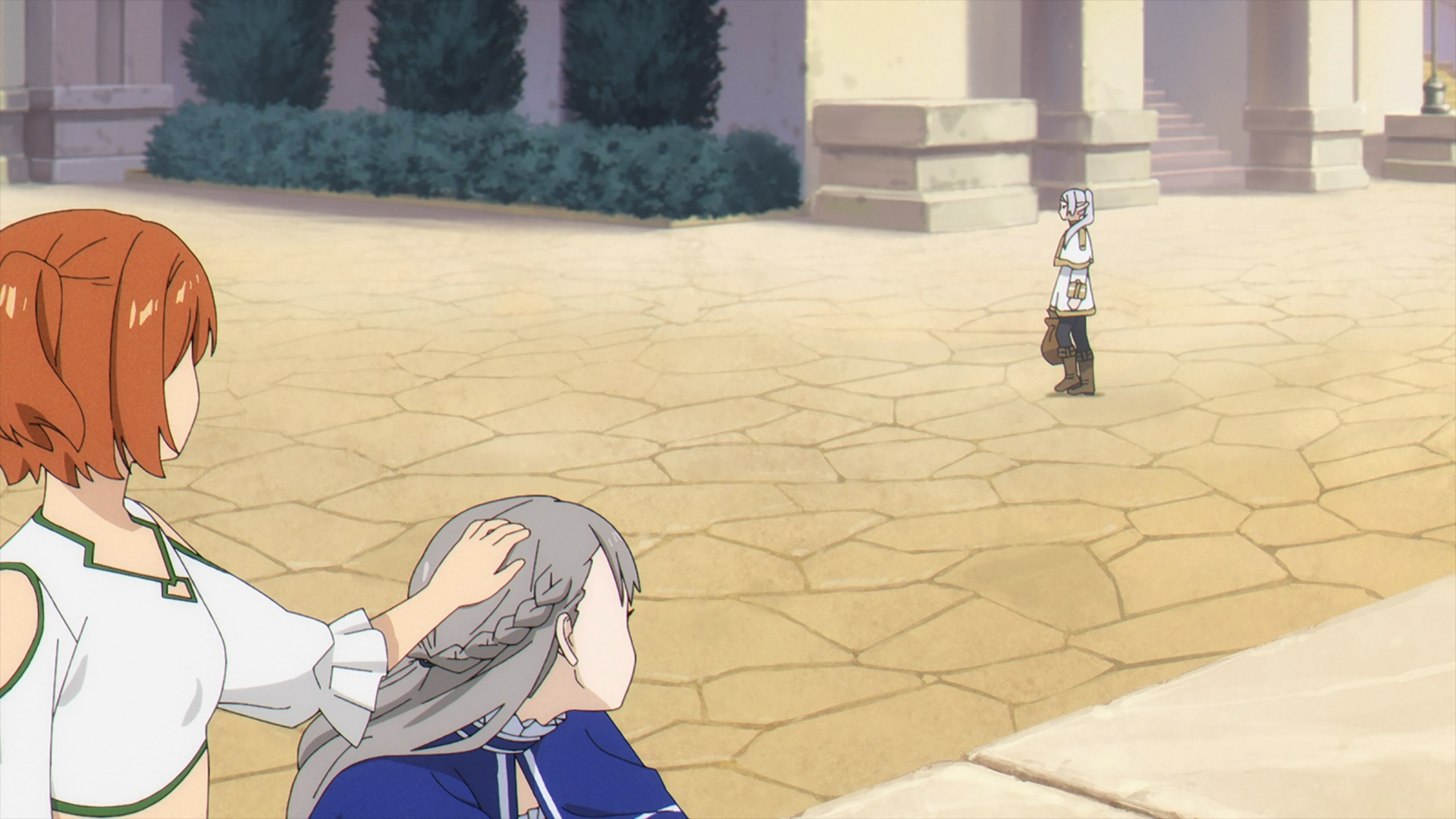 Kanne talks to a sulking Lawine as she mentions that it would be “3 years” before she can retake the First-Class Mage Exam. Lawine is down in the dumps and offers Kanne to get her payback. Kanne plays around that she thinks she should “pat her head” instead. Very uncharacteristically, Lawine gets up and hits next to her for her to comfort her. Kanne kindly pats her head when they notice Frieren walking nearby.