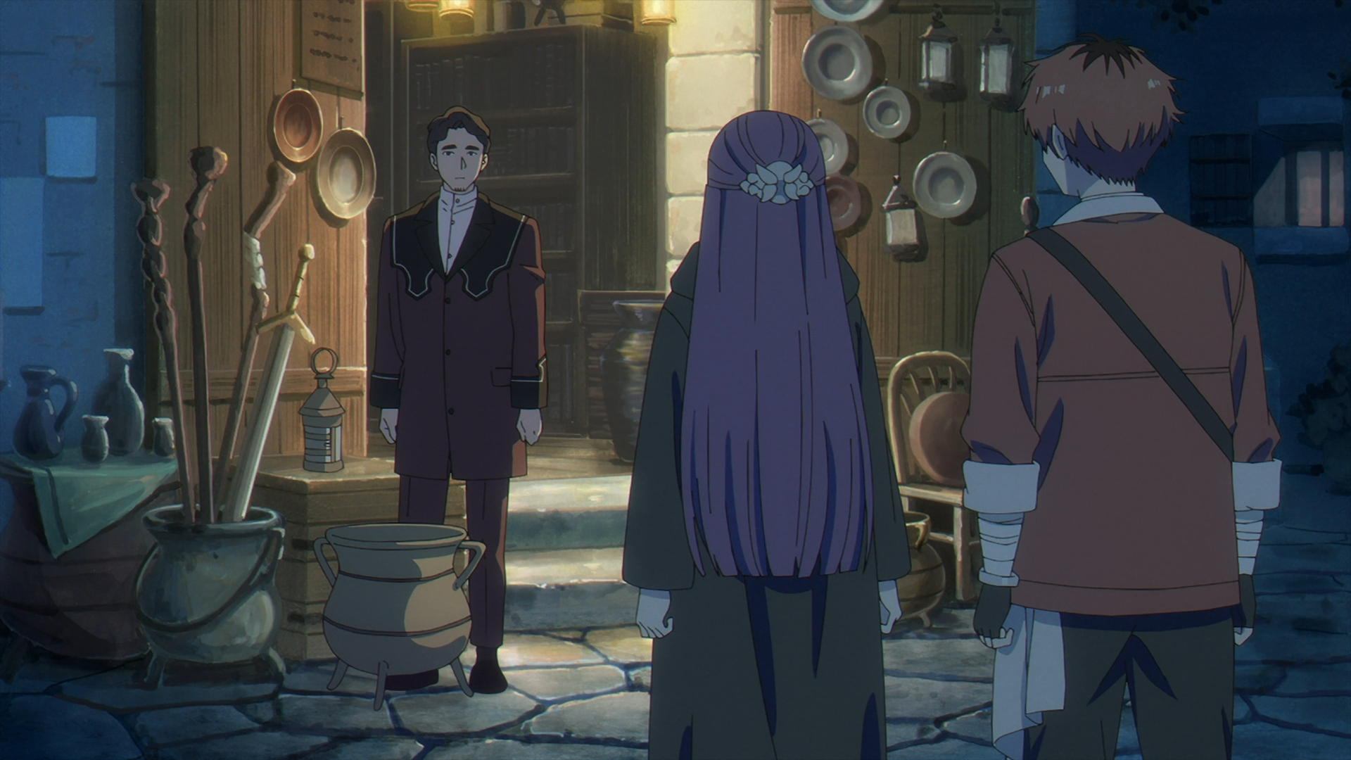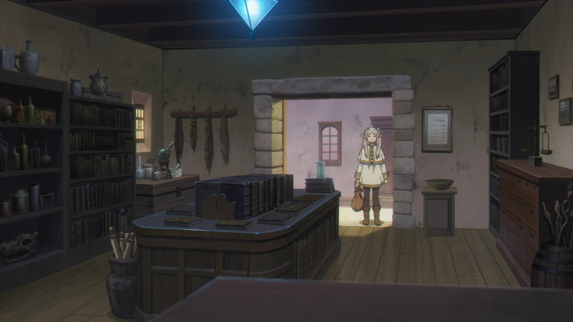 Stark & Fern walk by Richter’s shop and Richter is outside doing some kind of shop maintenance. He mentions to Fern that “she’s Frieren’s kid?” Fern gives no answer with an expressionless face. Stark has to step in to agree for her. Richter goes on to tell them how frustrated he was with what Frieren put him through. Furthermore, he tells her that he would have made more money if she just bought a new staff. In a little further glimpse of Richter’s kindness, he tells Fern to “take care of it.”
