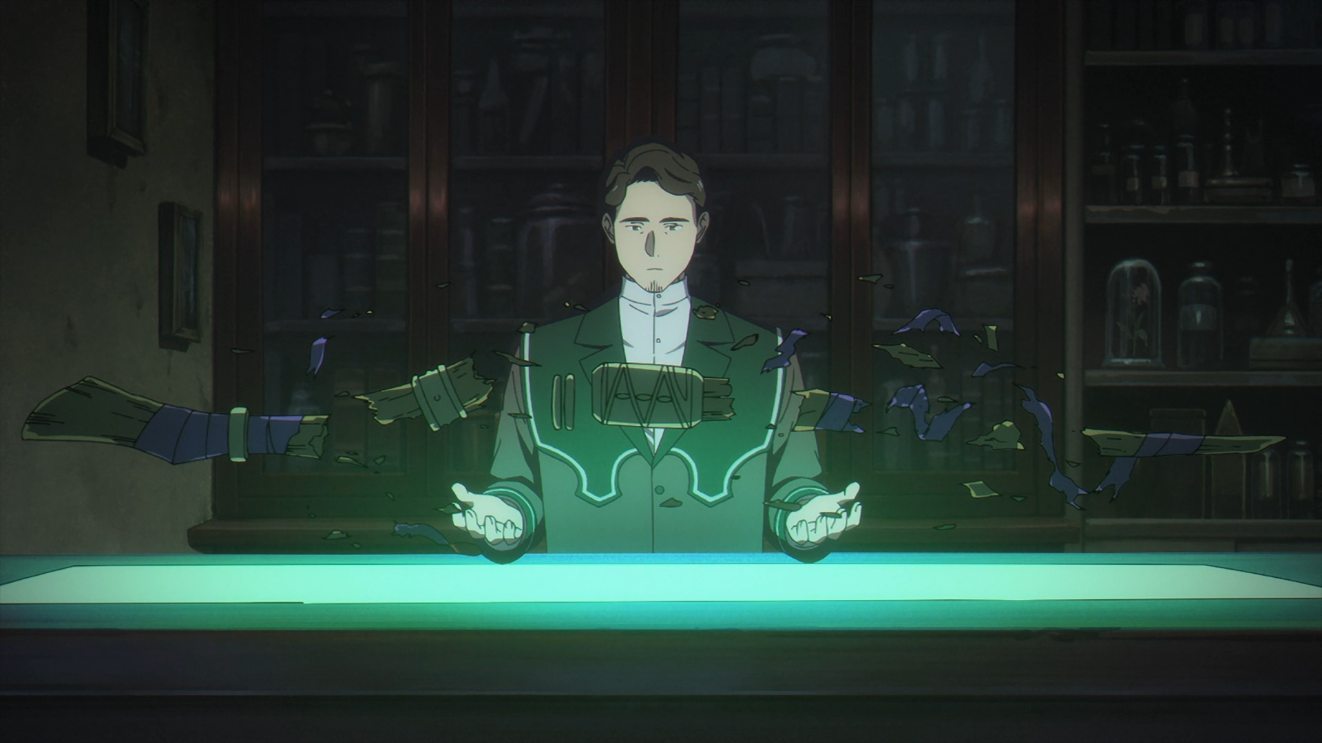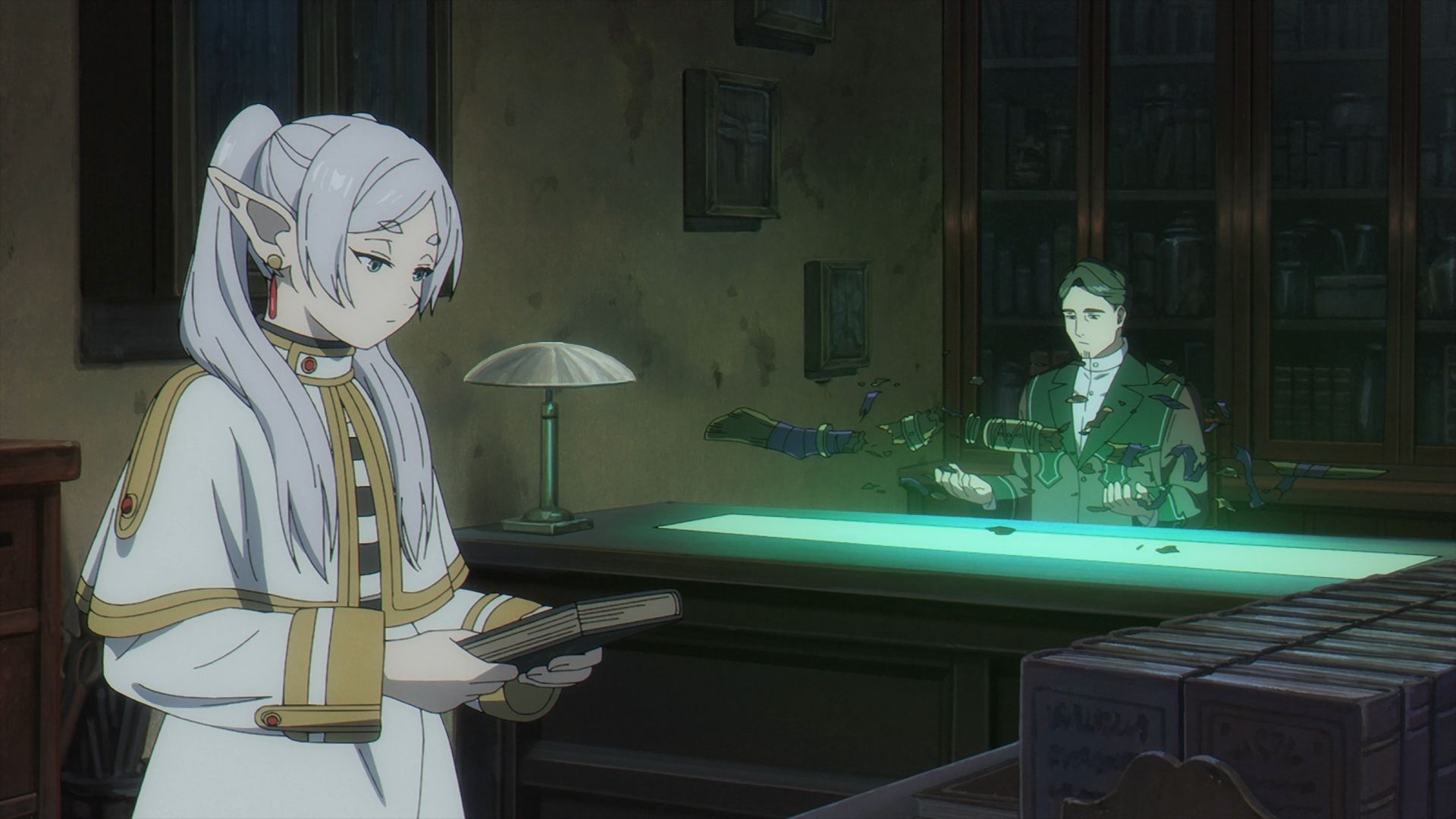 Richter begins fixing the staff with his magic as piece by piece, makes its way back into a restorative position. Frieren asks Richter to hurry, as it would be necessary to use by the last exam. In a sign of regret, Richter actually begins to apologize for calling the staff “trash,” since it really is a “well maintained staff.” He continues complementing the staff as that person must have truly cherished it.
